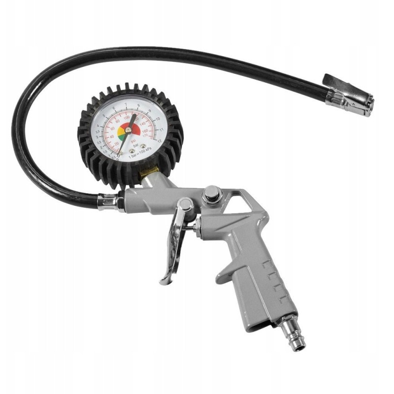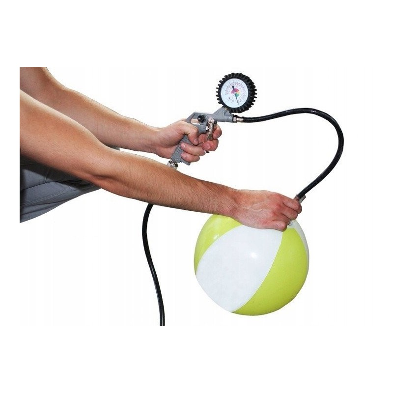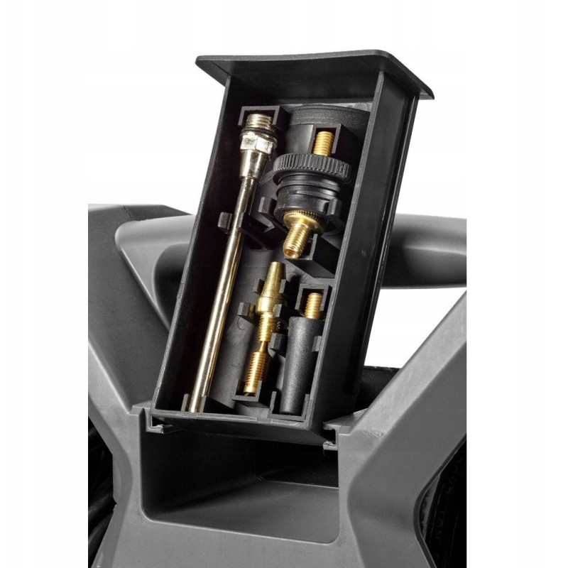 Kompresor posiada wbudowany wąż ciśnieniowy o dł. 3m, zestaw końcówek do pompowania oraz pistolet 2w1 - do pompowania z manometrem, a po zmianie końcówki która jest w komplecie - do przedmuchiwania.