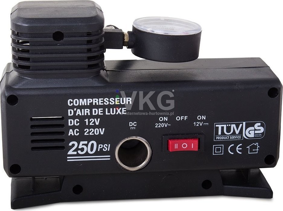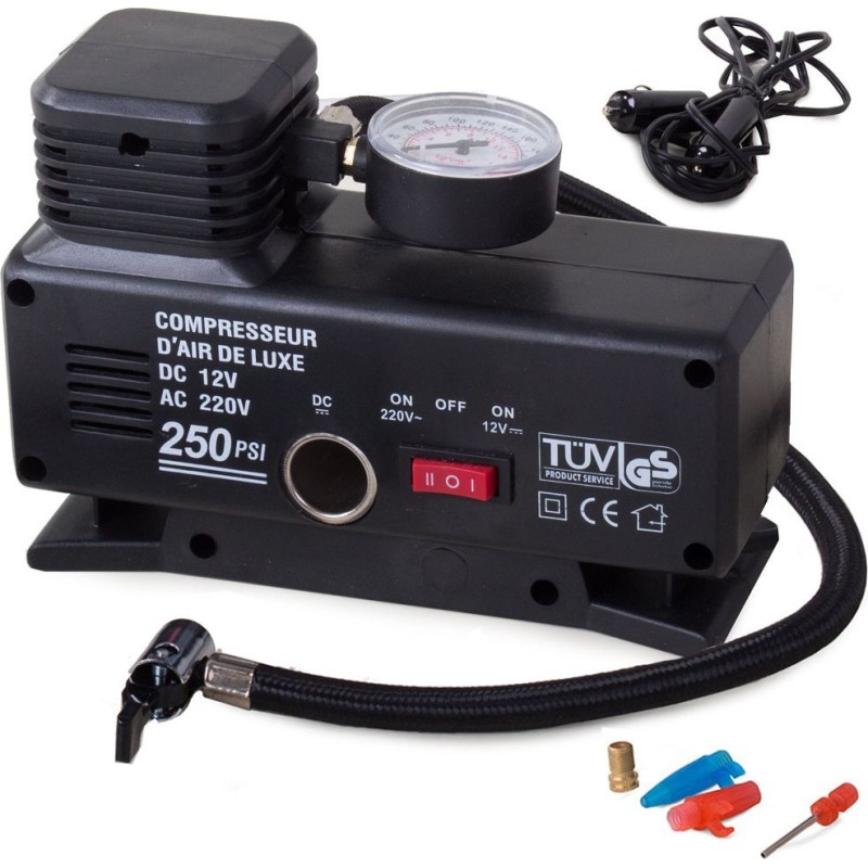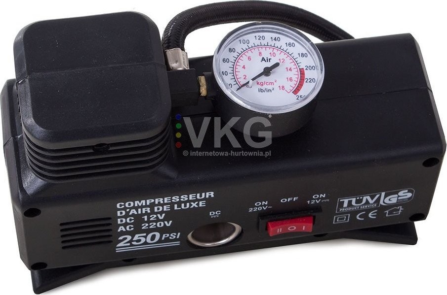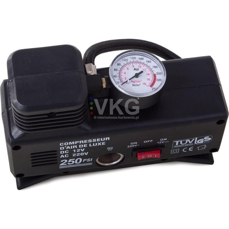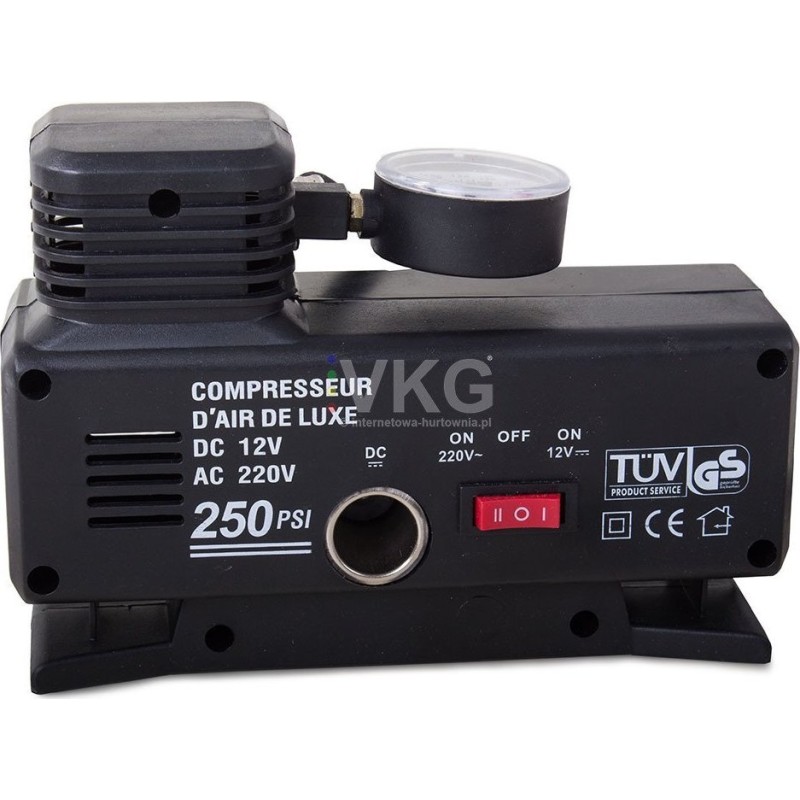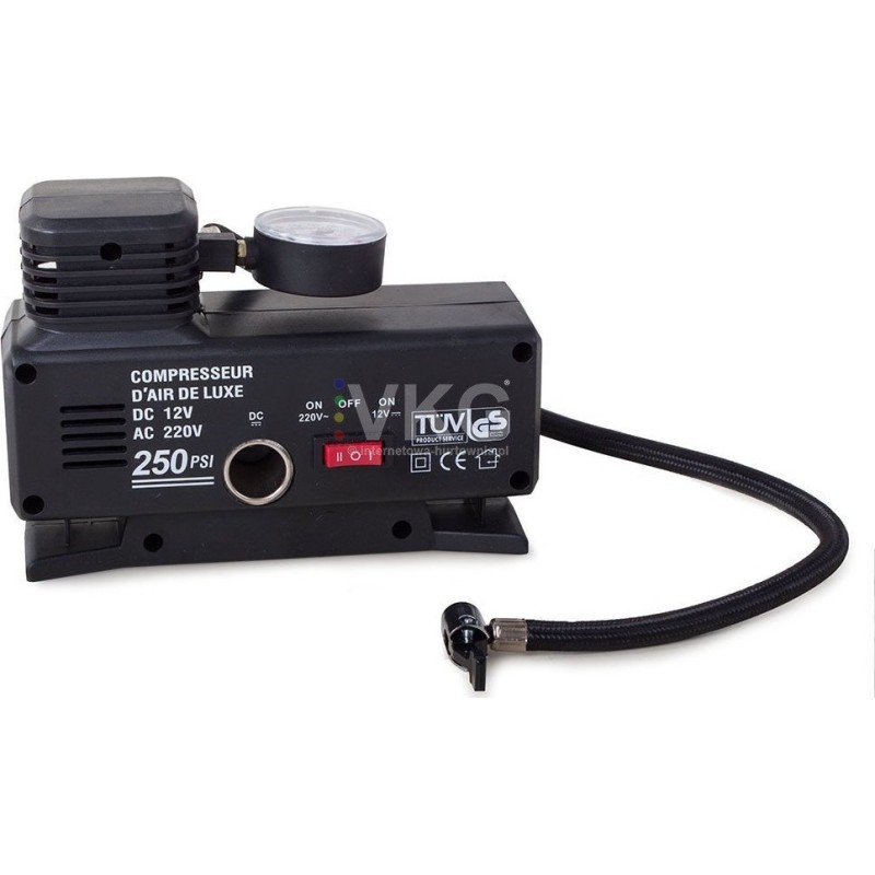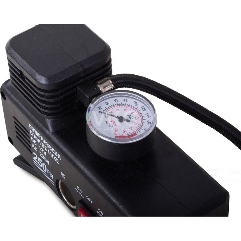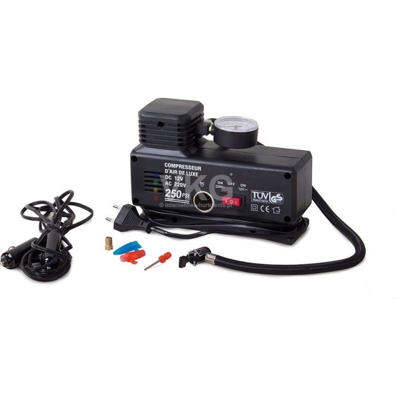 KOMPRESOR SAMOCHODOWY POMPKA 230V/12VWysokiej jakości kompresor zasilany z gniazda zapalniczki oraz za pomocą kabla sieciowego 230V. Doskonale nadaje się do pompowania wszelkiego rodzaju przedmiotów tj. koła samochodowe, rowerowe, piłki materace, itp.SPECYFIKACJA TECHNICZNA:✅ Kod produktu: 11008✅ Ciśnienie tłoczenia 250 PSI 18 kg/cm3 (są to rzeczywiste parametry pompowania).✅ Idealny do pompowania kół samochodowych, piłek, materacy, itp.✅ Wąż powietrzny o długości ok. 50 cm z zaworem zamykającym✅ Końcówki do pompowania artykułów sportowych - 3 szt✅ Wskaźnik ciśnienia (manometr)ZESTAW ZAWIERA:☑️ Kompresor z przewodem, wtyczką do gniazda zapalniczki, przewodem zasilającym 230V, manometrem.☑️ Zestaw końcówek do pompowania kół, piłek, itp.☑️ Oryginalne opakowanie