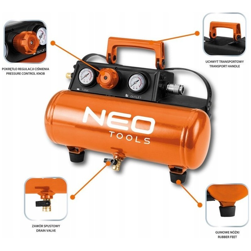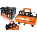 Charakteryzuje się pojemnością zbiornika 3,8 l, maksymalnym ciśnieniem 8 bar oraz wydajnością 14 l/minutę. Kompresor NEO polecany jest do pompowania, usuwania zanieczyszczeń oraz zasilania małych narzędzi pneumatycznych.