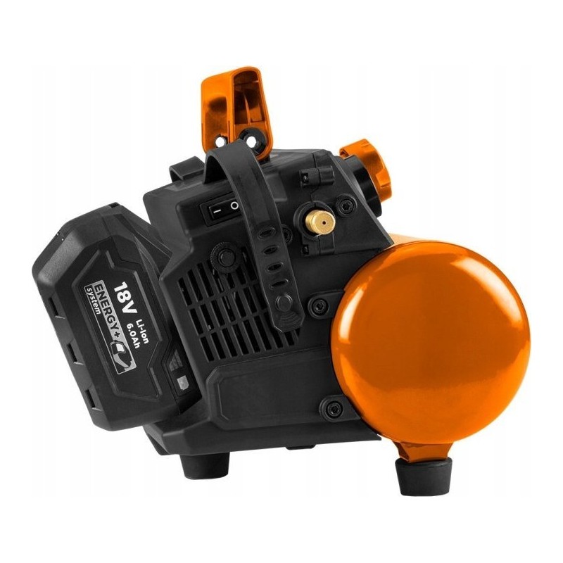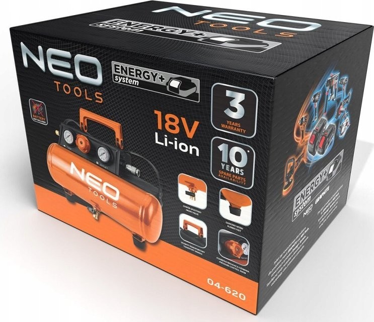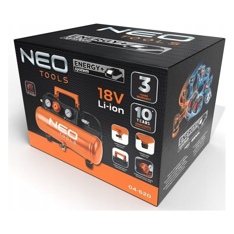 Kompresor na sprężone powietrze akumulatorowy Energy+ 18 V 04-620 marki NEO to bezolejowe urządzenie funkcjonujące w systemie akumulatorowym Energy+.