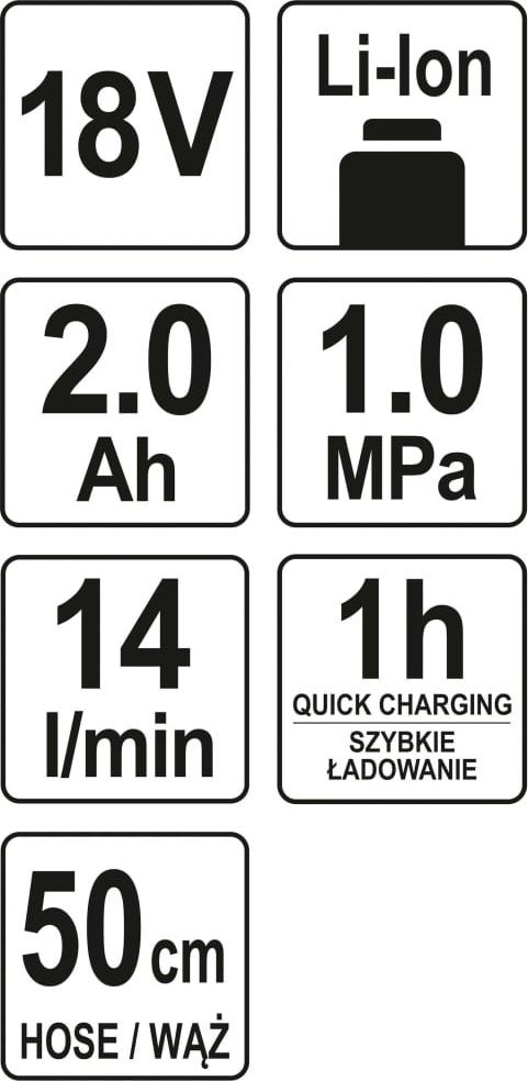 - Napompowuje koło samochodowe 15'' w około 2 minuty (od 0,5 bara do 2,0 barów)