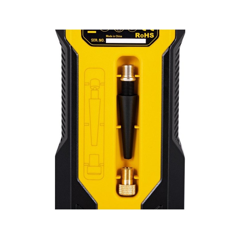 Na jednym ładowaniu akumulatora kompresor może napompować: 4 razy oponę samochodową R15 195x55, 8 razy oponę motocyklową R17 140x70, 8 razy oponę rowerową 700x28C oraz 70 razy piłkę do koszykówki. W zestawie znajdują się: uniwersalna dysza, igła do piłek, bezpiecznik, adapter do zaworu PRESTA, ładowarka samochodowa 12 V, kabel USB-C, wężyk z zaworem samochodowym oraz pokrowiec.