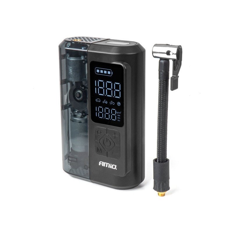 Kompresor AMIO-04378 wyróżnia się bezprzewodową konstrukcją, co zapewnia pełną swobodę użytkowania. Dzięki akumulatorowi o pojemności 2 × 2000 mAh, urządzenie oferuje długi czas pracy bez konieczności podłączania do zewnętrznego źródła zasilania. Elastyczny wężyk do pompowania o długości 16 cm ułatwia obsługę i pozwala na komfortowe napełnianie kół, piłek oraz innych przedmiotów.