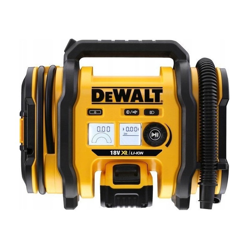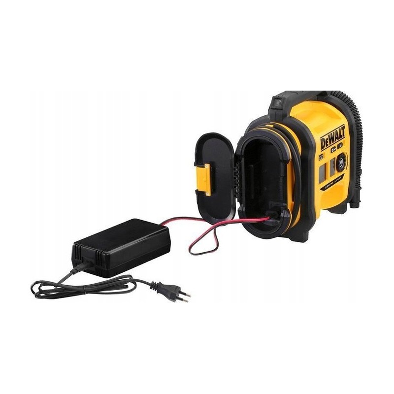 - kompresor może być zasilany z 3 niezależnych źródeł, poprzez: •gniazdo zapalniczki w samochodzie o napięciu 12V (przewód z wtyczką do zapalniczki jest w zestawie) • akumulator Li-Ion 18V DeWalt (brak na wyposażeniu) •zasilacz z sieć 230V (brak na wyposażeniu)