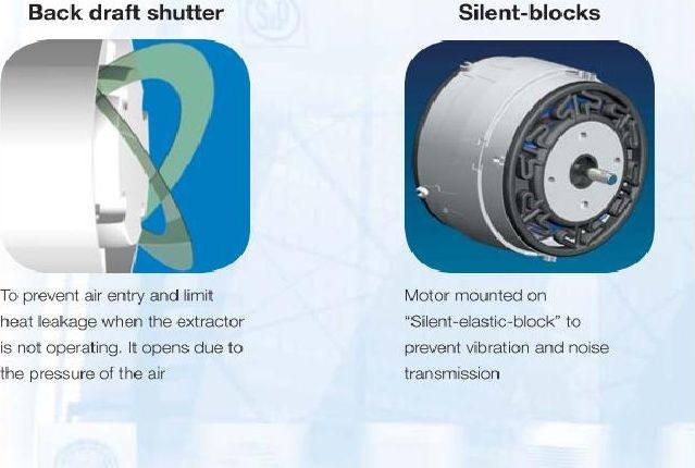 Gdy wentylator jest wyłączony, klapa zwrotna zapobiega dostawaniu się do pomieszczenia powietrza zewnętrznego i wydostawaniu się powietrza ogrzanego. Gdy wentylator działa, klapa zwrotna otwiera się, aby umożliwić wydajne usunięcie niechcianego powietrza.