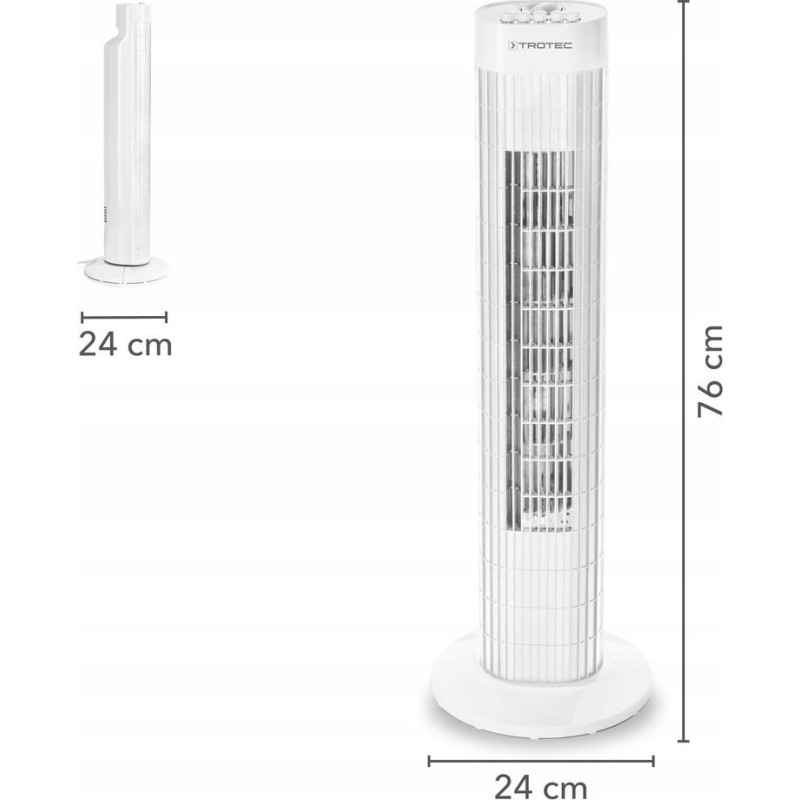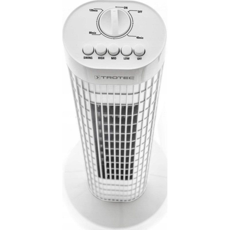 Model TVE 30 T jest gotowy do pracy od razu po rozpakowaniu. Ustawienie parametrów roboczych odbywa się za pomocą elementów sterowania umieszczonych w górnej części urządzenia. Oscylacje automatycznie dostosowują się do wybranej prędkości pracy. Stabilność, równomierne działanie i niski poziom hałasu wentylatora są osiągnięte dzięki okrągłej podstawie. Wbudowana rączka ułatwia przenoszenie urządzenia.
