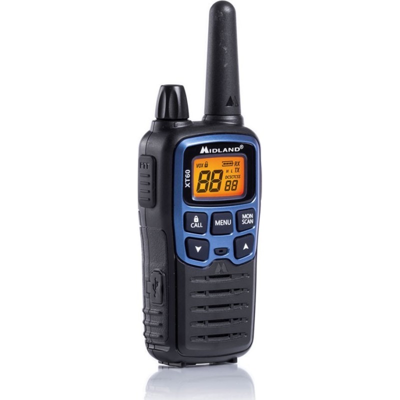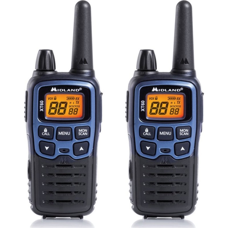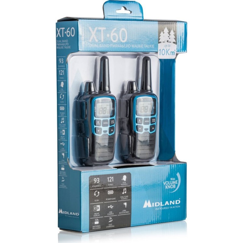 Midland XT60. Ilość kanałów (ogółem): 24 kan., Częstotliwość (MHz): 446.00625 - 446.0937 Mhz. Typ wyświetlacza: LCD. Rodzaj baterii: AAA. Waga produktu: 112 g, Wymiary produktu (SxGxW): 54 x 33 x 120 mm. Liczba baterii włączone: 2 szt.