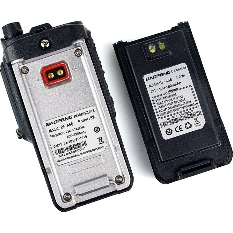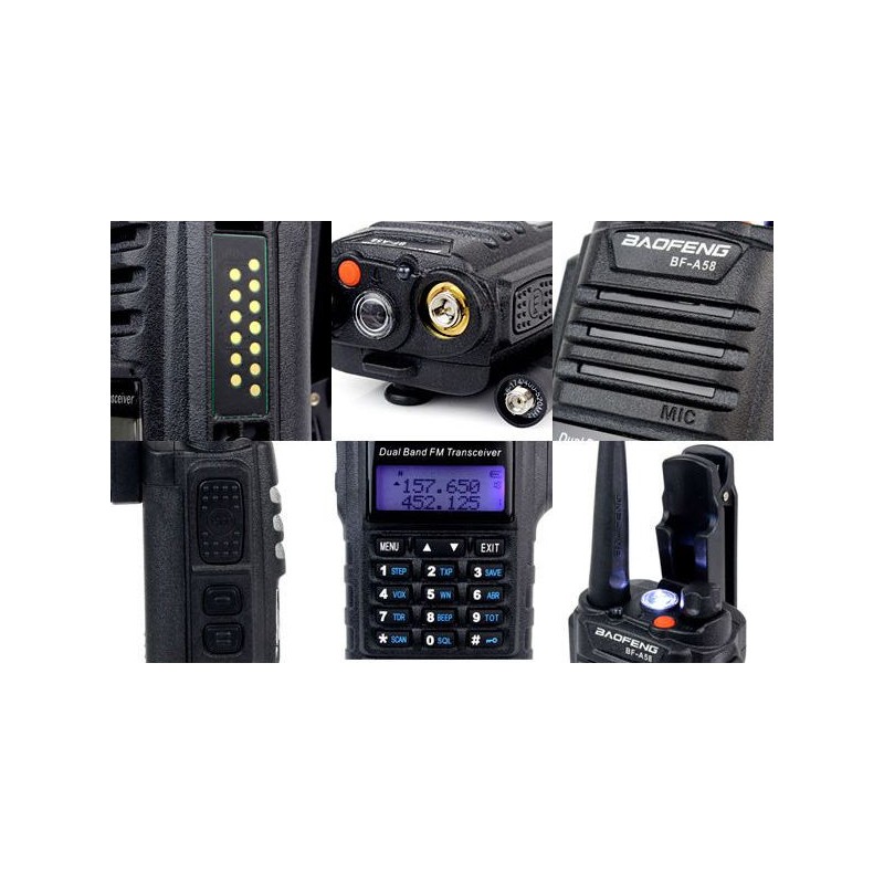 Baofeng BF-A58 to kurzo i wodoodporny (IP57) dwupasmowy radiotelefon (duobander) o mocy 5 watów z podwójnym wyświetlaczem, klawiaturą DTMF i funkcją Dual Watch. Duobander wyposażono w podwójny wyświetlacz, selektywne wywołanie, Dual Watch, latarkę LED oraz wiele innych funkcji. Wbudowane radio FM pozwala w przerwach rozmowy słuchać ulubionej stacji, automatycznie przełączając się na wybrany kanał po odebraniu sygnału od drugiej stacji. Podstawa zasilająca pozwala ładować tak radiotelefon jak i samą baterię.