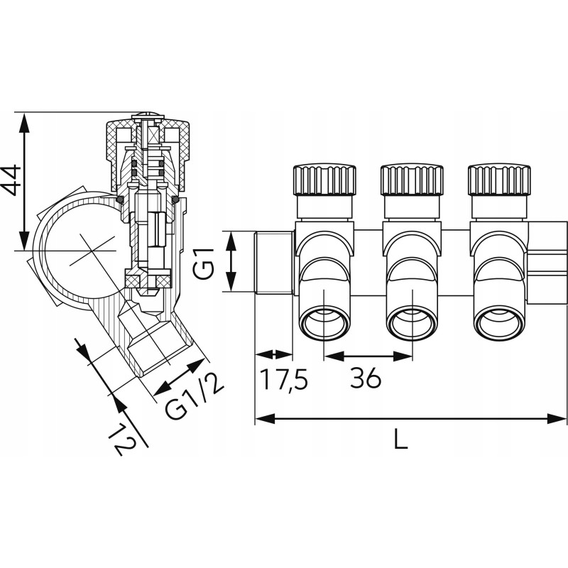 MOSIĘŻNY ROZDZIELACZ SANITARNY FERRO DO UŻYTKOWEJ WODY 1” x 1/2” 2 DROGOWY