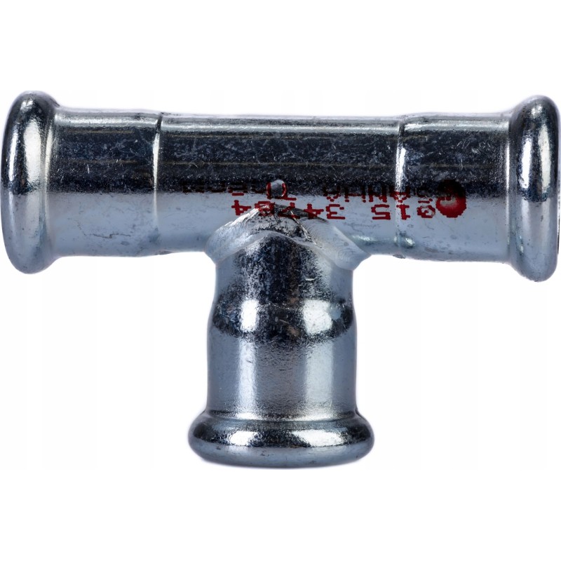 Złączka redukcyjna 54 x 35 x 54 ZW SANHA®-Therm (Seria 24000) wykonana z ocynkowanej stali węglowej z czarnymi uszczelkami z Kauczuk monomeryczny etylen-propylen-dien (EDPM), łączona z ocynkowanymi rurami SANHA®-Therm ze stali węglowej.