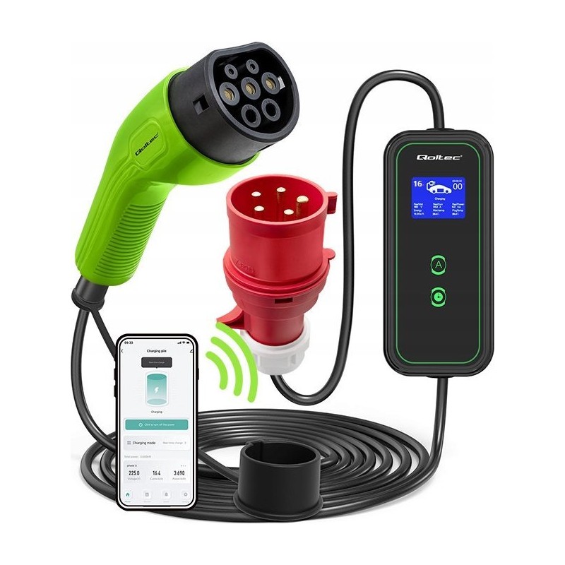 Qoltec Ładowarka do samochodu elektrycznego EV z regulacją 2w1 Typ2 | 11kW | CEE 5 PIN | Wi-fi| LCD | 3 fazy | Przenośna | Wallbox | 5m