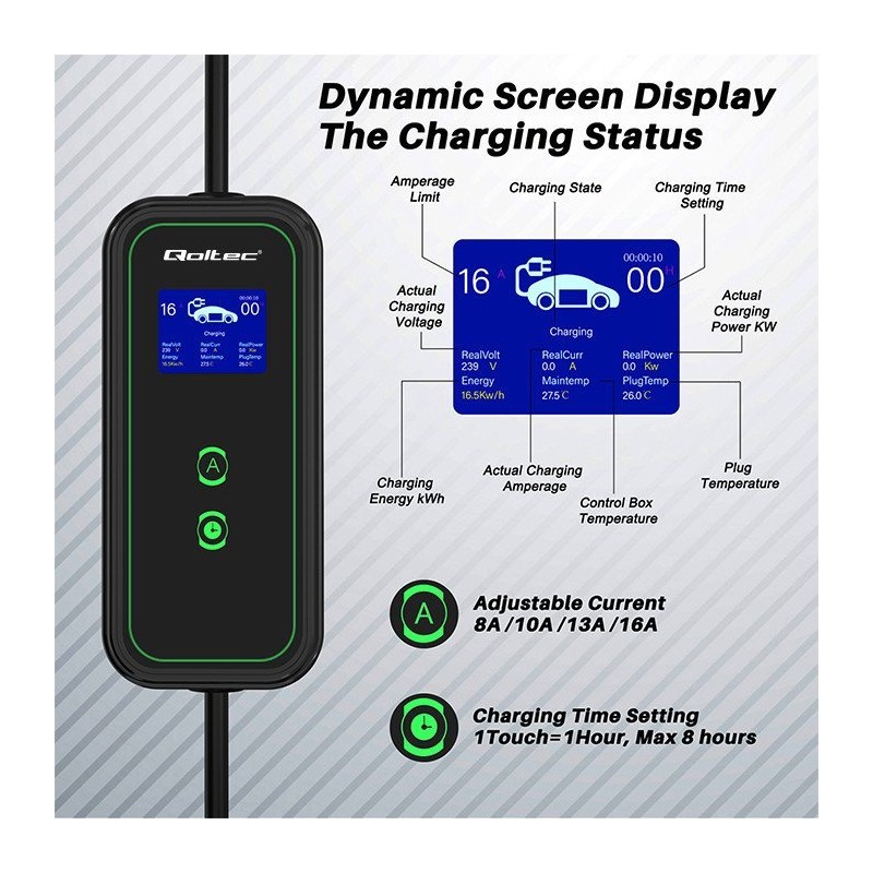 Ładowarka posiada złącze typu 2, które jest obecnie oficjalnym standardem Unii Europejskiej i ładuje auta elektryczne wyposażone w odpowiednie gniazdo ładowania. Złącze typu 2 to 7 styków, z których 3 styki lub 5 przeznaczone są do ładowania, a 2 do komunikacji między stacją a samochodem. Kompatybilne z większością samochodów elektrycznych sprzedawanych w Europie. Ładowarka ta obsługuje cztery tryby natężenia prądu 8A, 10A, 13A i 16A. Warto dodać, że złącze typu 2 jest przeznaczone dla pojazdów elektrycznych o mocy ładowania większej niż 3kW.