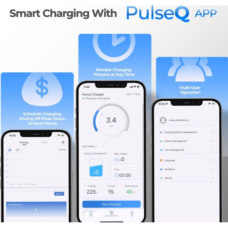 - Korzystanie z aplikacji na smartfony kompatybilnej z PulseQ; planuj czasy ładowania, sprawdzaj przebieg i koszt ładowania, otrzymuj powiadomienia o całkowitym naładowaniu i dostosuj prąd ładowania.