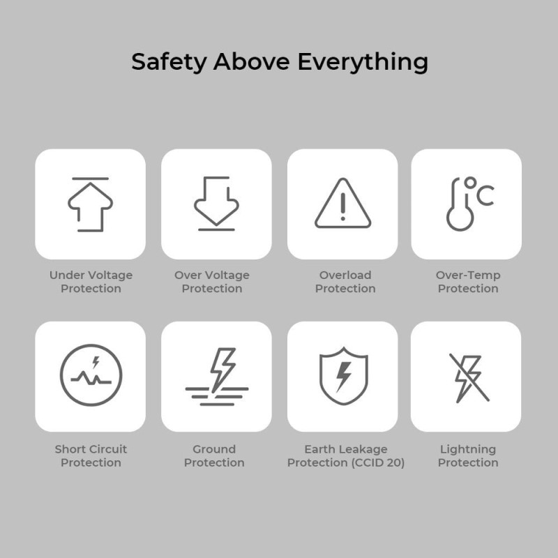 - Funkcje bezpieczeństwa obejmują ochronę podnapięciową, ochronę nadnapięciową, ochronę przed przeciążeniem, ochronę przed przegrzaniem, ochronę przed zwarciem, ochronę uziemienia, ochronę przed upływem prądu (DC 6ma + typ A) i ochronę odgromową.
