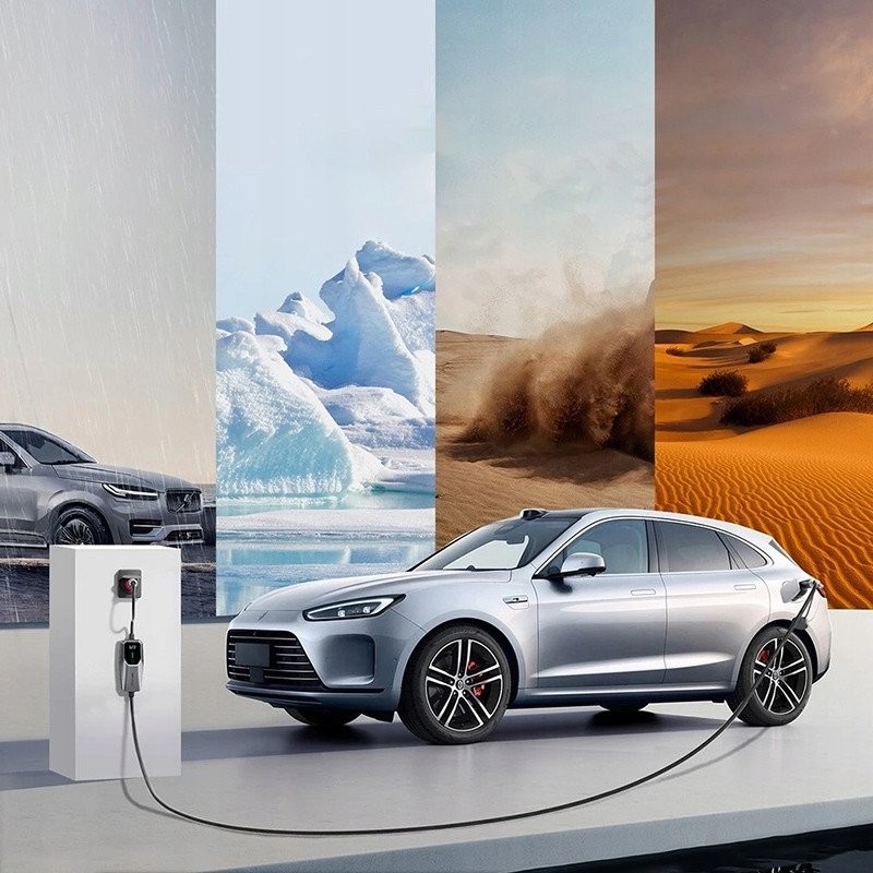 Kabel ładowarki wyróżnia się wysoką odpornością na warunki atmosferyczne, posiadając klasę ochrony IP65. Dzięki temu jest zarówno wodoodporny, jak i pyłoszczelny, co zapewnia niezawodność w różnych warunkach pogodowych. Dodatkowo, jego konstrukcja z materiałów odpornych na ekstremalne temperatury (od -30 °C do 50 °C) gwarantuje długą żywotność.