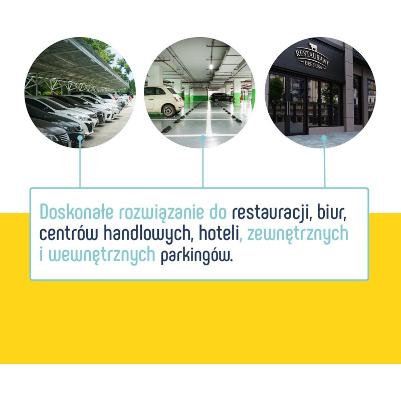 - Doskonałe rozwiązanie do restauracji, biur, centrów handlowych, hoteli, zewnętrznych i wewnętrznych parkingów itp.