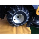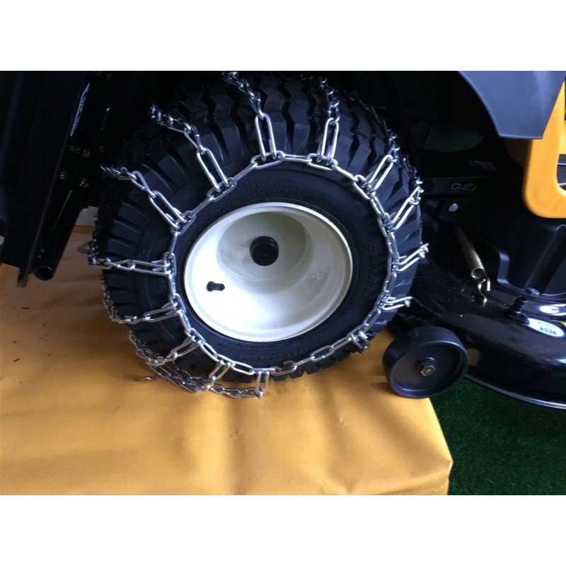 W zestawie znajdują się także łańcuchy na tylne koła, które są niezbędne podczas zimowych prac odśnieżających. Oferowane w różnych rozmiarach, łańcuchy można łatwo dopasować do konkretnego modelu traktora, co zwiększa bezpieczeństwo i stabilność podczas pracy w trudnych warunkach.