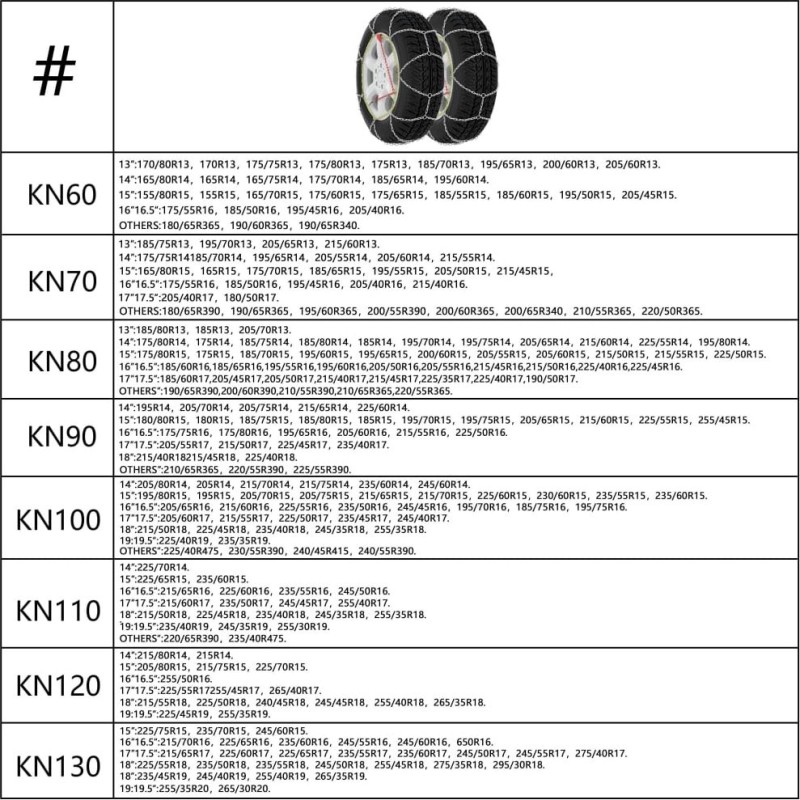 Zakładanie łańcuchów na koła samochodowe jest łatwe i szybkie. Można je zamontować bez konieczności przejeżdżania samochodem. W skład dostawy wchodzi nylonowy worek ułatwiający przechowywanie. Odnieś się do dołączonej tabeli rozmiarów, aby sprawdzić, które łańcuchy śniegowe będą pasować Twojego samochodu.