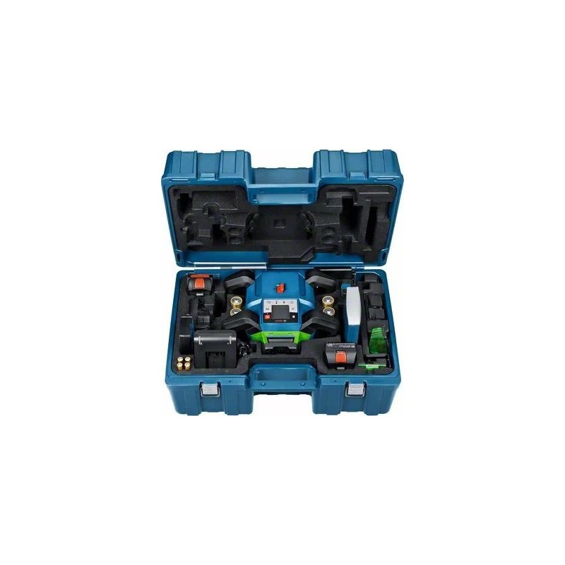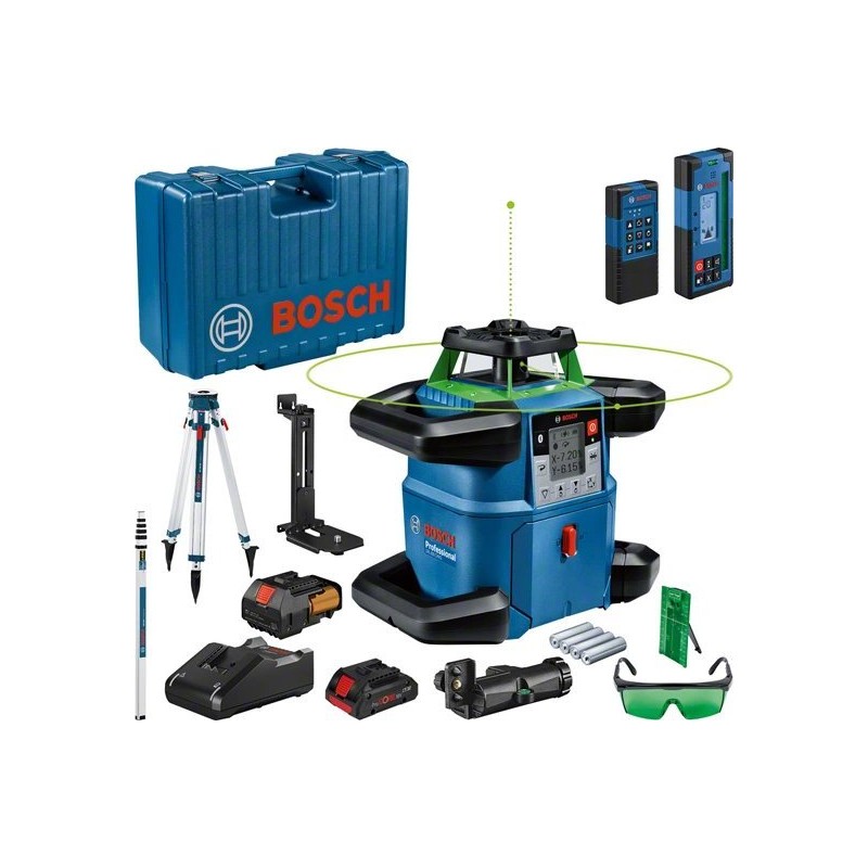 Bosch GRL 650 CHVG. Maksymalny zasięg: 70 m, Dokładność poziomowania (±): 1,5 mm/m, Zakres samopoziomowania (±): 360°. Model: Niwelator obrotowy, Kolor produktu: Czarny, Niebieski, Zielony, Gwint statywu: 5/8". Źródło zasilania: Bateria, Czas operacyjny: 60 h, Technologia baterii: Litowo-jonowa (Li-Ion). Szerokość produktu: 327 mm, Głębokość produktu: 188 mm, Wysokość produktu: 278 mm. Rodzaj opakowania: Pudełko