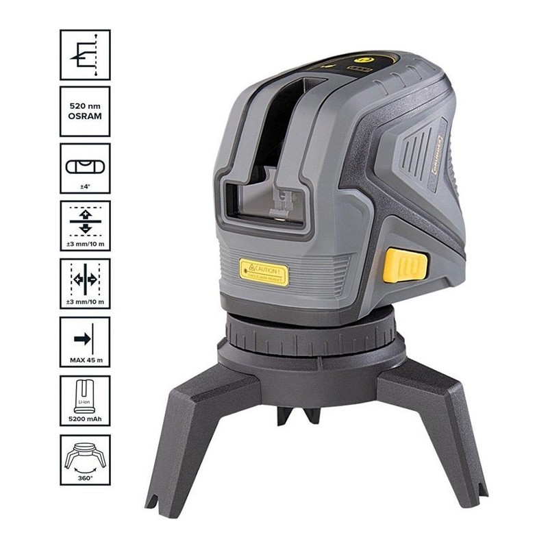 Cechy produktuDzięki 360° kątowi obrotu i kątowi pomiarowemu od 110 do 180°, poziomowanie jest szybkie i łatwe, co zmniejsza ryzyko błędów. Lazer dodatkowo zaznacza punkty pionowe do 60 m. Zielony kolor linii laserowej zapewnia dobrą widoczność nawet w jasnym świetle. Urządzenie zasilane jest akumulatorem litowo-jonowym i ma klasę ochrony IP54, co oznacza, że jest odporne na kurz i wilgoć.