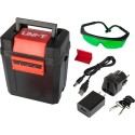 Poziomica laserowa z trzema liniami lasera z funkcją automatycznego samopoziomowania przeznaczona do użytku wewnętrznego i zewnętrznego. Możliwość obrotu o 360 stopni oraz regulowana struktura urządzenia pozwalają na korzystanie z niego w różnych warunkach powierzchniowych utrzymując tę samą dokładność. Poziomica jest wodoodporna, odporna na zabrudzenia oraz posiada czułe przyciski.