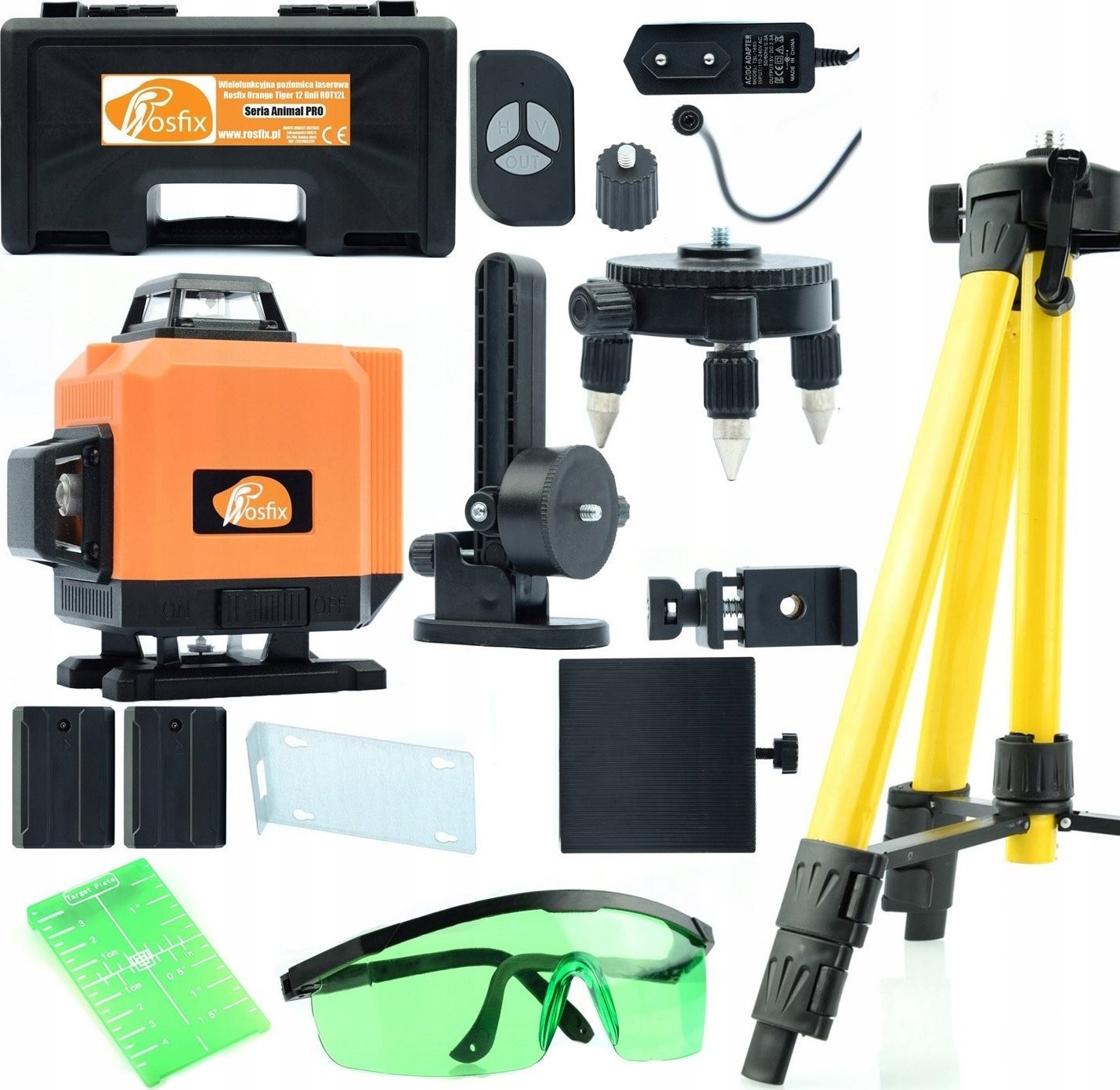 Poziomica laserowa Rosfix Orange Tiger 12 linii ROT12L w walizce z zestawem + Statyw 43-120cm do poziomicy laserowej + okulary zabezpieczające do lasera + Zielona tarcza
