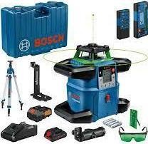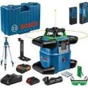 Bosch GRL 650 CHVG. Maksymalny zasięg: 70 m, Dokładność poziomowania (±): 1,5 mm/m, Zakres samopoziomowania (±): 360°. Model: Niwelator obrotowy, Kolor produktu: Czarny, Niebieski, Zielony, Gwint statywu: 5/8". Źródło zasilania: Bateria, Czas operacyjny: 60 h, Technologia baterii: Litowo-jonowa (Li-Ion). Szerokość produktu: 327 mm, Głębokość produktu: 188 mm, Wysokość produktu: 278 mm. Rodzaj opakowania: Pudełko