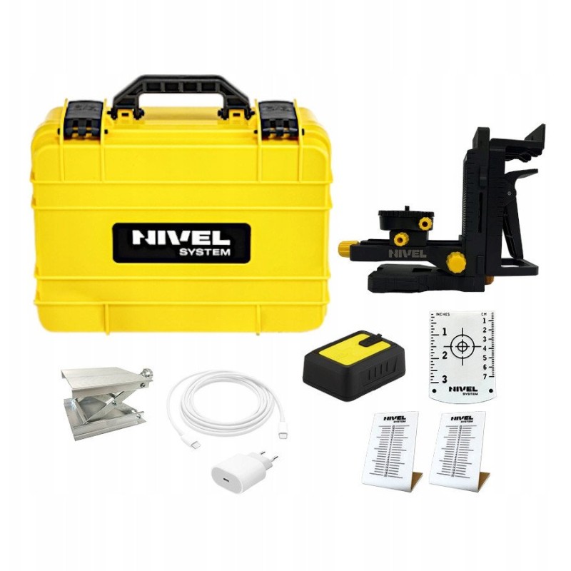 W zestawie z laserem NIVEL SYSTEM CL5B znajdują się tarczki podłogowe, multi-adapter, adapter laserowy, akumulator oraz ładowarka, co zapewnia pełną funkcjonalność i gotowość do pracy od razu po zakupie.