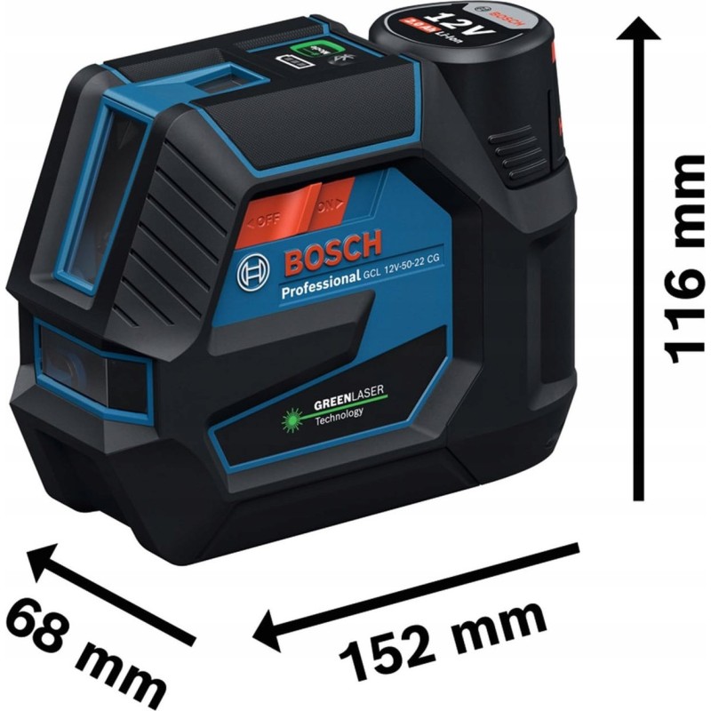 Laser GCL 12V-50-22 CG zasilany jest akumulatorem Li-Ion 12 V oraz czterema bateriami 1,5 V LR6 (AA). Dzięki temu użytkownicy mogą wybrać najdogodniejsze źródło zasilania, co zwiększa elastyczność i komfort użytkowania.