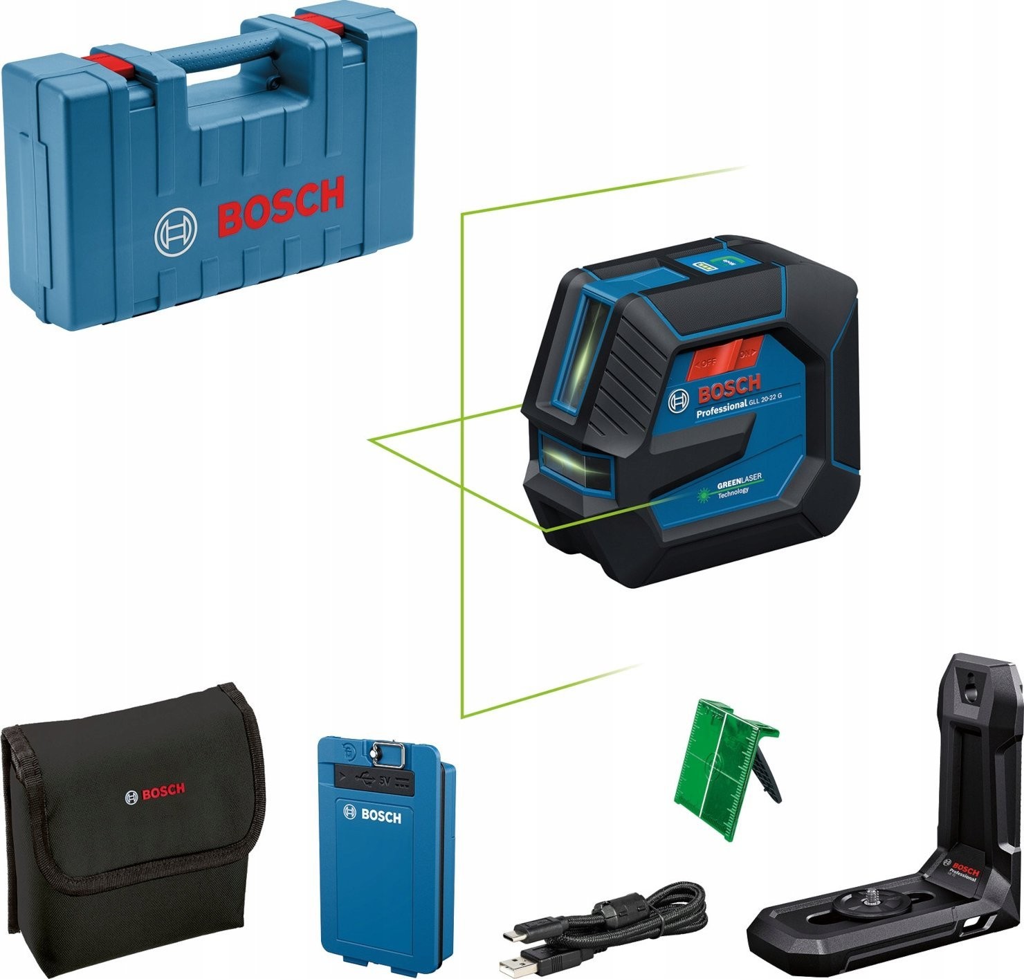 BOSCH.CROSS LASER GLL 20-22 G GREEN USB-C 1x BA 3.7V 3.0Ah XL + HOLDER LB 10 CASE