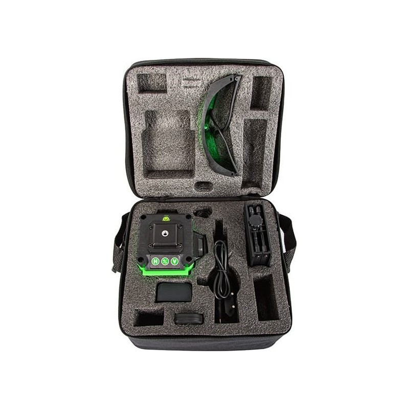 Jak używać poziomicy laserowej:Umieść urządzenie na statywie, uchwycie ściennym typu T lub platformie podnoszącej, jeśli to konieczne.Przesuń głwny przełącznik zasilania do pozycji włączonej (ON), a urządzenie zacznie działać. Okno poziome otwiera się automatycznie i generuje cztery poziome wiązki laserowe.Dotknij klawisz H na panelu dotykowym, aby sterować włączeniem i wyłączeniem poziomej wiązki laserowej.Dotknij klawisz V na panelu dotykowym raz, aby włączyć pionową wiązkę laserową, po drugim kliknięciu otwiera drugą wiązkę pionową, a po kliknięciu trzecim, zamyka obie otwarte wcześniej wiązki.Przytrzymaj klawisz wyłączania przez więcej niż 3 sekundy, usłyszysz kliknięcie (tick), a funkcja diagonalna włączy się. W tym czasie możesz dostosować urządzenie do dowolnego kąta bez alarmu i migania. Ponowne przytrzymanie tego klawisza przez więcej niż 3 sekundy, wyłączy tę funkcję, a urządzenie będzie działać normalnie.Specyfikacja: