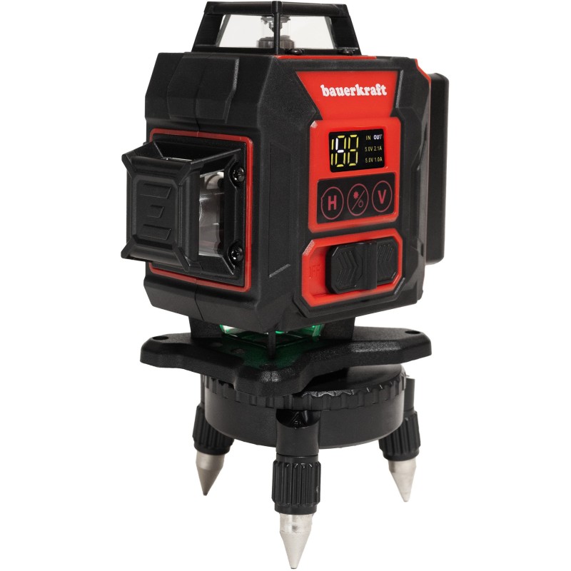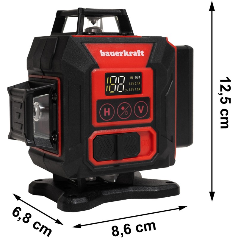 Precyzyjna poziomica laserowa została wyposażona w zielony laser 532 nm, który zapewnia dokładne i wyraźne linie oraz funkcję autopoziomowania eliminującą błędy, podczas nachylenia urządzenia powyżej 3°, wiązka zaczyna migać, sygnalizując konieczność regulacji. Jest odporna na działanie pyłu, kurzu i zachlapania, co sprawia, że dzięki klasie wodoodporności na poziomie IP54 można jej używać zarówno wewnątrz, jak i na zewnątrz. Poziomica laserowa 4D 360° posiada 2 akumulatory 2400 mAh, co pozwala na ciągłą pracę bez przerw, kiedy jeden akumulator pracuje, drugi można ładować, to idealne rozwiązanie dla fachowców, którzy potrzebują niezawodnego sprzętu przez długi czas.