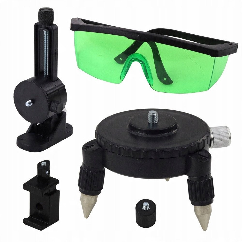 - Zawartość zestawu: poziomica laserowa 4D, 2x bateria litowa, ładowarka, platforma podnosząca, magnetyczna obrotowa podstawa, uchwyt do statywu, pilot zdalnego sterowania, podstawa aluminiowa, okulary ochronne, torba z gąbką ochronną