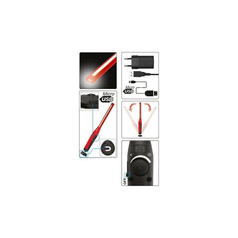 Niezastąpiona podczas prac wymagających doświetlenia obszaru roboczego. Posiada 2 źródła światła – główne usytuowane z przodu oraz latarkę czołową. Obrotowy korpus 360° zamocowany na podstawie z magnesem umożliwia dowolne ustawienie pozycji lampy, z precyzyjnie nakierowanym strumieniem światła. Zaletą lampy warsztatowej jest regulowane światło główne w zakresie 60-600lm, mocny akumulator 3.7 V 2600 mAh oraz oraz funkcja latarki. Długa, cienka górna część lampy ułatwi oświecenie trudno dostępnych miejsc.