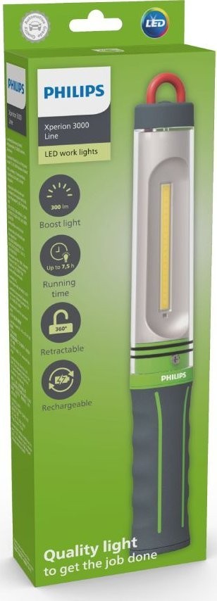 Lampa warsztatowa bezprzewodowa Philips Xperion 3000 Line to profesjonalne narzędzie, które sprawdzi się w wielu sytuacjach, takich jak inspekcje czy naprawy. Dzięki szerokiemu kątowi padania światła wynoszącemu 120°, skutecznie eliminuje cienie, co znacznie podnosi komfort pracy.