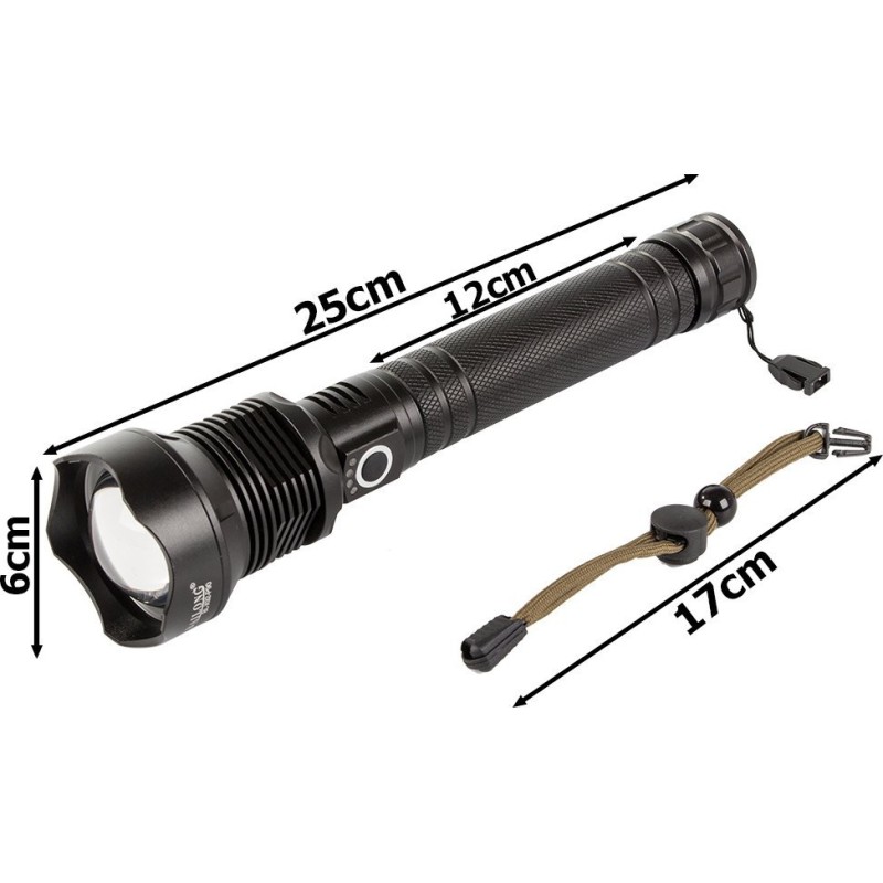 LATARKA TAKTYCZNA WOJSKOWA Z DIODĄ LED CREE XHP90 ZOOM MODEL X92 RENOMOWANEJ MARKI BAILONGreg; POSIADAMY PRAWO WYŁĄCZNE DO NAZWY BAILONGreg;. ZAREJESTROWANE W URZĘDZIE PATENTOWYM POD NUMEREM R.280898 Latarka wojskowa marki Bailongreg; model X92 została zaprojektowana z myślą o taktycznym zastosowaniu. Może być używana przez służby mundurowe, wojsko, myśliwych, miłośników przyrody lub do użytku domowego. Korpus latarki został wykonany z najmocniejszego stopu dostępnego na rynku - aluminium lotniczego, który został pokryty twardą anodyzacją, dzięki czemu zwiększa jej wytrzymałość na uszkodzenia przy jednoczesnym utrzymaniu niskiej wagi. Dodatkowo powierzchnia latarki jest antypoślizgowa. Dzięki zastosowaniu systemu uszczelek oraz bardzo dobremu spasowania elementów, latarka jest odporna na oddziaływanie intensywnego deszczu, wilgoci oraz błota. Latarka została wyposażona w najnowocześniejszą diodę półprzewodnikową CREE P90 Jest to najsilniejsza dioda, która może oślepić każdego. Żywotność diody sięga do 100 000 godzin.Posiada również diody LED, które informują o stanie naładowania oraz ładowania ogniw. Funkcja zoom - płynna regulacja zmiany ogniskowej padania światła, dzięki wykorzystaniu soczewki skupiającej Daje to możliwość regulacji od wąskiego mocnego promienia światła o dalekim zasięgu - 1000m do szerokiego pola, który oświetla duży obszar roboczy. Te cechy sprawiają, że latarka niesamowicie sprawdza się w każdym terenie. Do zasilania latarki został użyty wysokiej jakości litowo-jonowy akumulator/ogniwo 26650, który pozwala na długi czas pracy latarki.Cały zestaw zapakowany jest w eleganckie i sztywne pudełko, dzięki czemu idealnie nadaje się na prezent. Zastosowana elektronika sterująca modułem pozwala na wybór jednego z trzech trybów świecenia:✅ 100% mocy✅ 50% mocy✅ Stroboskop SPECYFIKACJA TECHNICZNA:✅ Kod produktu: 08319✅ Wykonana z wysokich jakości materiałów✅ Producent: Bailongreg;✅ Model: X92✅ Obudowa: aluminium lotnicze✅ Pokryta anodyzowaną powłoką✅ Typ diody: CREE XHP90✅ Zasięg: 1000m✅ Żywotność diody: do 100 000 godzin✅ Funkcja zoom - wysuwany✅ Tryb pracy: 100%, 50%, stroboskop✅ Klasa wodoszczelności: IPX5✅ Antypoślizgowa powierzchnia zapobiega ślizganiu latarki w dłoni✅ Ergonomiczna oraz wygodna rękojeść✅ Uszczelniona systemem uszczelek typu o-ring✅ Odporna na warunki atmosferyczne✅ Odporna na wstrząsy✅ Zasilanie: 2 x akumulator/ogniwo 26650 lub 18650✅ Ładowanie: kabel USB-C✅ Posiada praktyczną smycz do zawieszania✅ Posiada diody LED informujące o stanie naładowania i ładowania ogniw✅ Waga (bez ogniwa): 330g✅ Produkt posiada certyfikat CE WYMIARY:✅ Długość: 25cm✅ Długość z wyciągniętym zoom: 27,5cm✅ Średnica: 6cm✅ Długość Smyczki: 17cm ZESTAW ZAWIERA:☑️ Fabrycznie nową latarkęnbsp;klasyczną model X92☑️ 2 x akumulator 26650☑️ 2 x adapter do akumulatorów 18650☑️ Kabel USB-C☑️ Smycz na nadgarstek☑️ Oryginalne opakowanie
