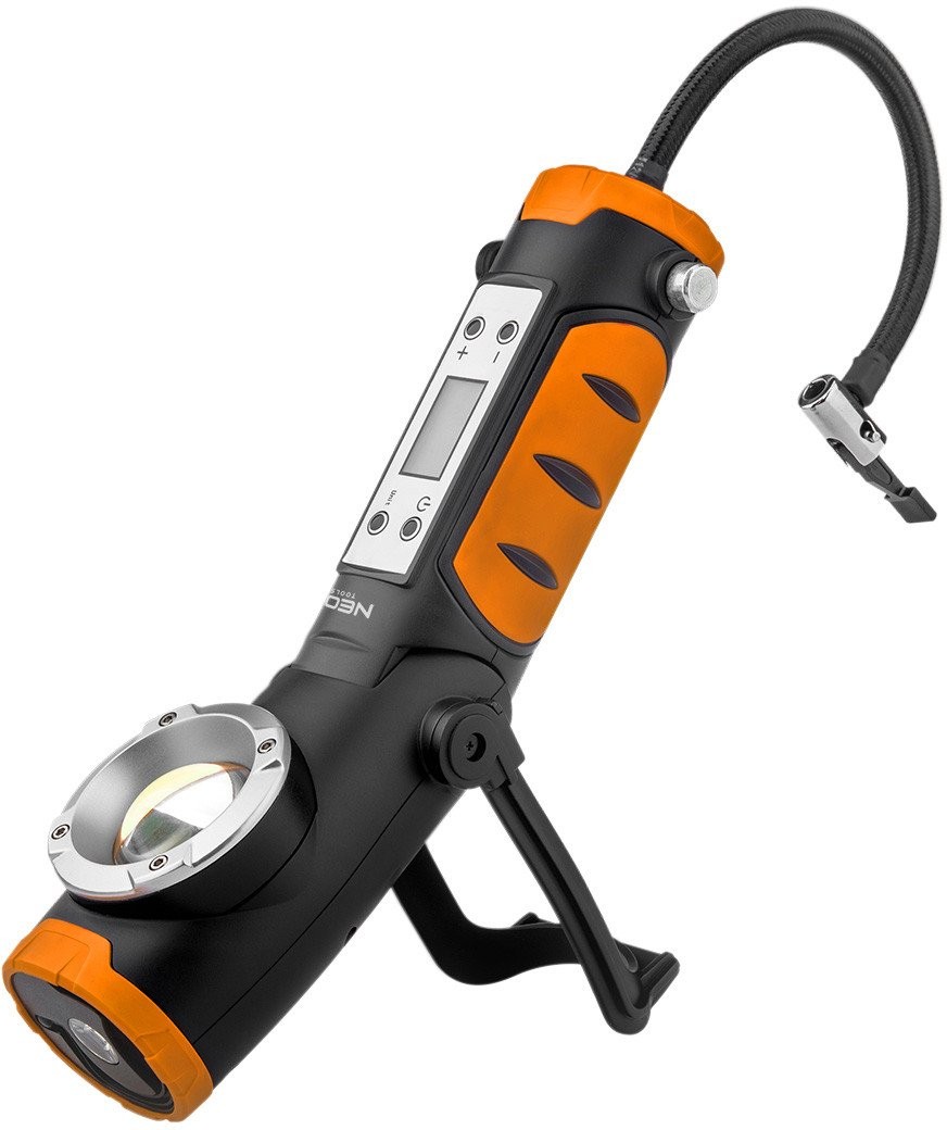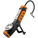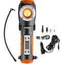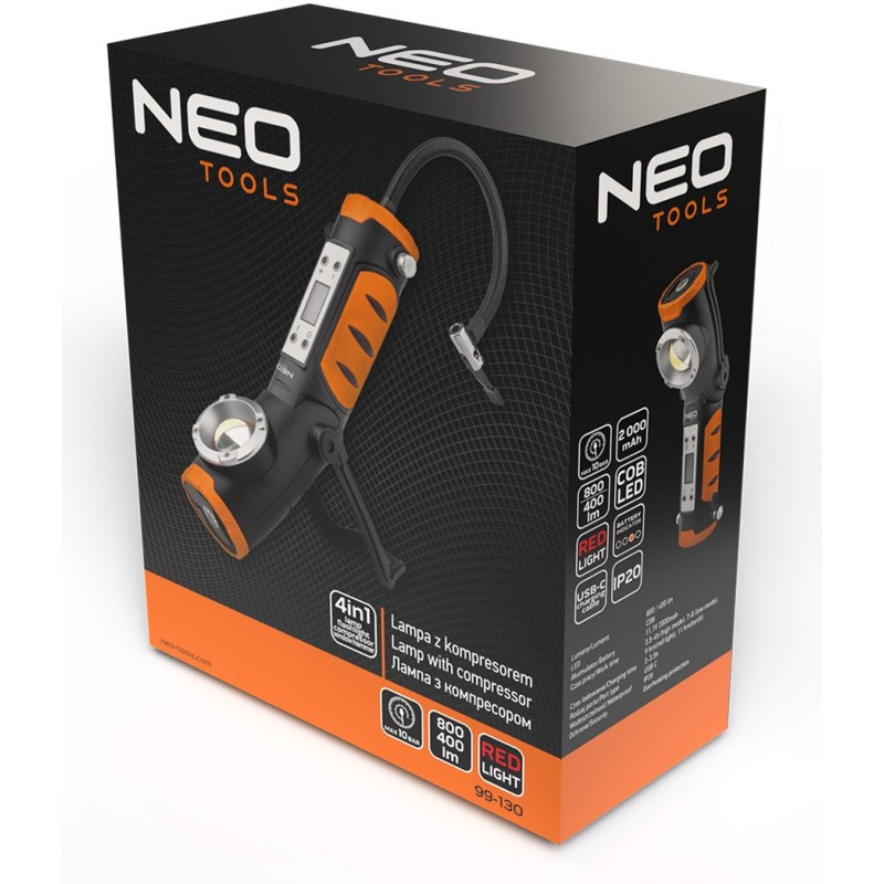 Lampa akumulatorowa COB LED, 800+400 lumenów, 4 w 1 lampa, latarka, kompresor, młotedo do szyb, bateria 2000mAh 11.1V, kompresor max 10 BAR, IP20, ochrona przed przegrzaniem, ruchoma głowica, USB C, czerwone światło, podpórka, wskaźnik naładowania baterii, cyfrowy wyświetlacz kompresora, dotykowy panel, czas pracy 3.5-4h high mode, 7-8h low mode, 9h czerwone światło, 11h latarka, czas ładowania 3-3.5h, zestaw zawiera lampa, zasilacz samochodowy, przewód USB C, wężyk do pompowania kół, igła, adapter rowerowy, 2 rodzaje końcówek do pompowania, bezpiecznik