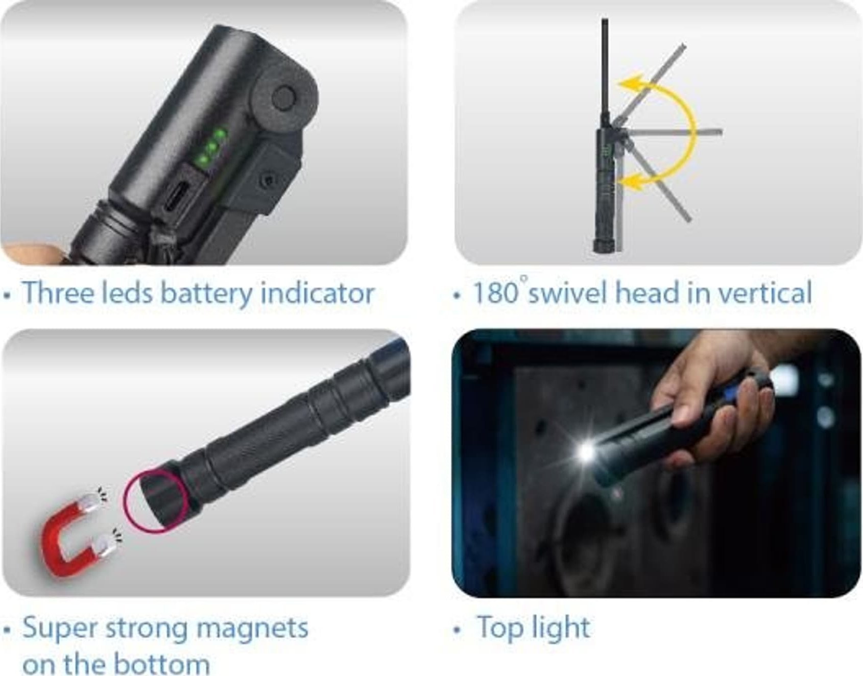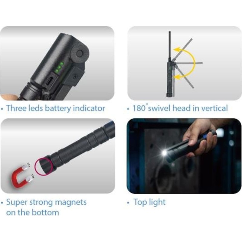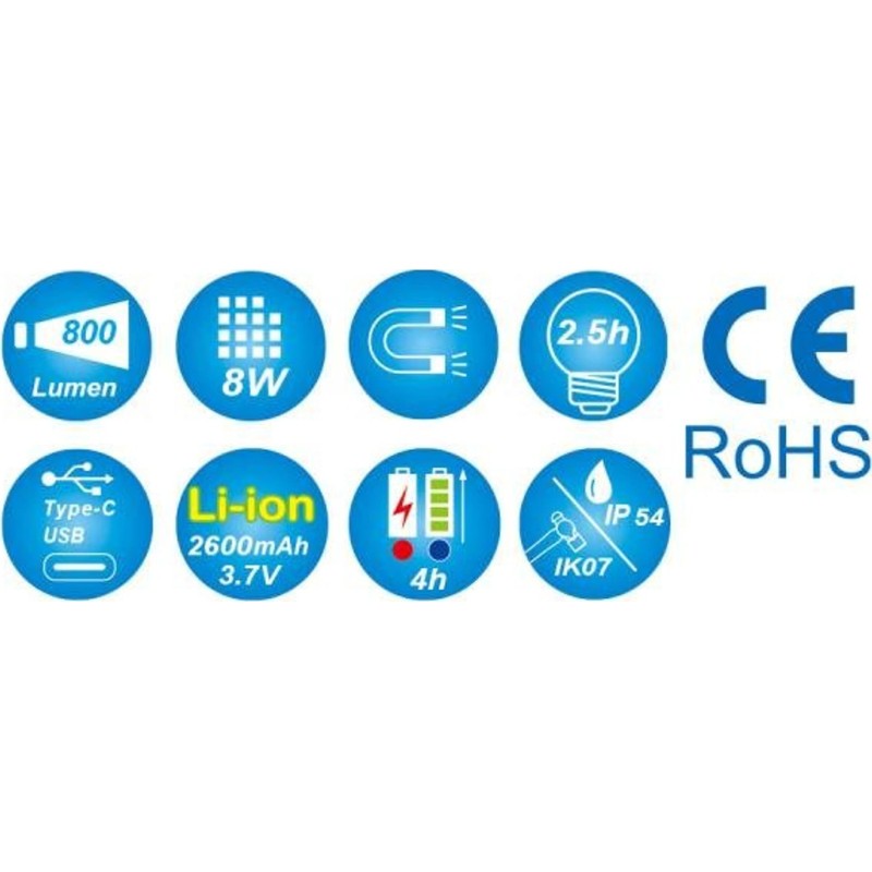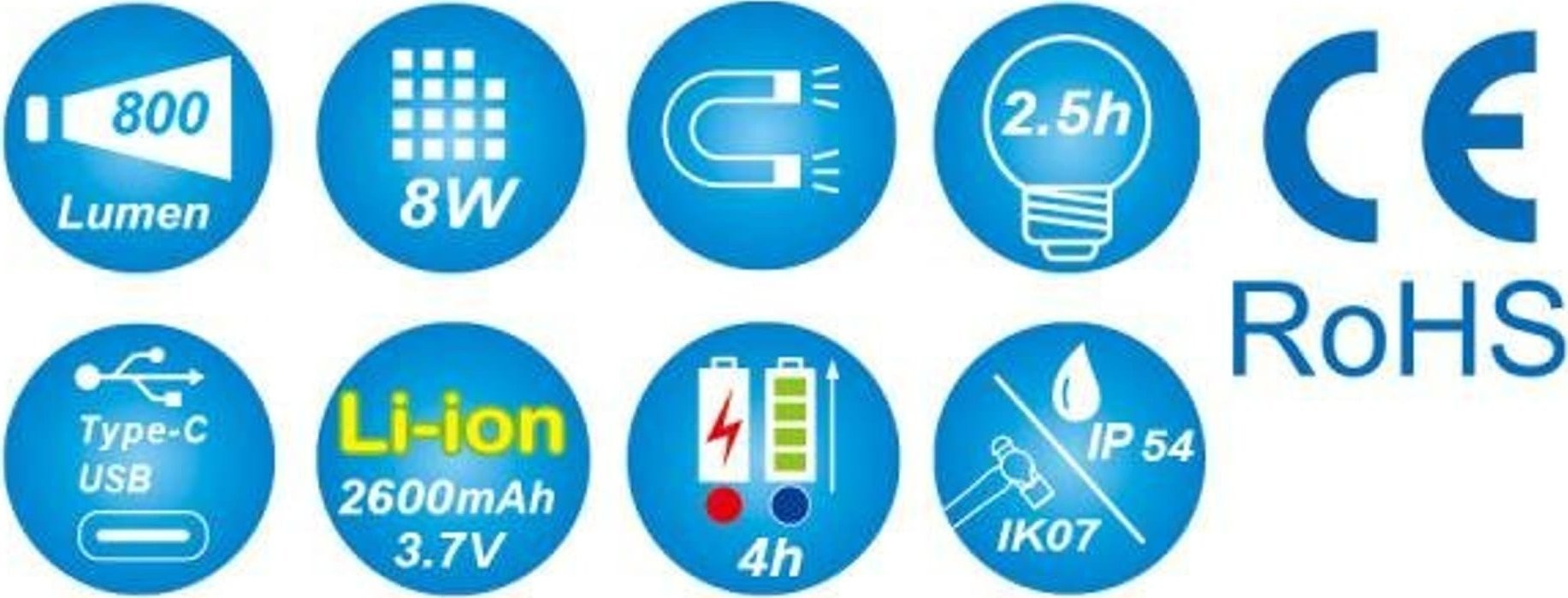 Barwa światła białego: 6500K.Przełącznik strumienia światła i czas pracy:- Reflektor górny: 120 lm; 8 godz.- Reflektor boczny 1: Niski/Wysoki: 150/800 lm; 8/2,5 godz.- Reflektor boczny 2: Niski/Wysoki: 120/400 lm: 9/4 godz.Materiał: PA + guma + obudowa aluminiowa.Głowica obrotowa 180 ° w pionie. Mocna podstawa magnetyczna.Akumulator: litowo-jonowy 3,7 V - 2600 mAh.Akcesoria: kabel ładujący USB typu C i ładowarka USB 5 V 1 A.Ledowy wskaźnik baterii.Czas ładowania: 4 godz.