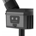 Praktyczny design urządzenia obejmuje wbudowany uchwyt do nawijania kabla, co zapewnia porządek i bezpieczeństwo w miejscu pracy. Obustronne wkręty gruntowe umożliwiają stabilne ustawienie na nierównym terenie, a możliwość używania światła w złożonym stanie zwiększa jego wszechstronność.