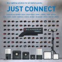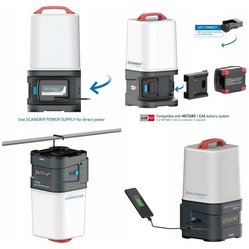 Jedną z unikalnych cech AREA 10 CONNECT jest kompatybilność z akumulatorami METABO / CAS 18 V oraz wszystkimi innymi akumulatorami 18 V/20 V wiodących marek narzędzi elektronarzędziowych za pomocą złącza SCANGRIP: