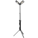Jego kompaktowe wymiary po złożeniu sprawiają, że lampa robocza jest łatwa do transportu. Zintegrowane, składane nóżki i funkcja teleskopowa wygodnie obejmują statyw. Na podstawie dostępny jest również zwijacz kabla. Kolce gruntowe zintegrowane z odpowiednimi nóżkami są również przydatne na nieutwardzonych powierzchniach.