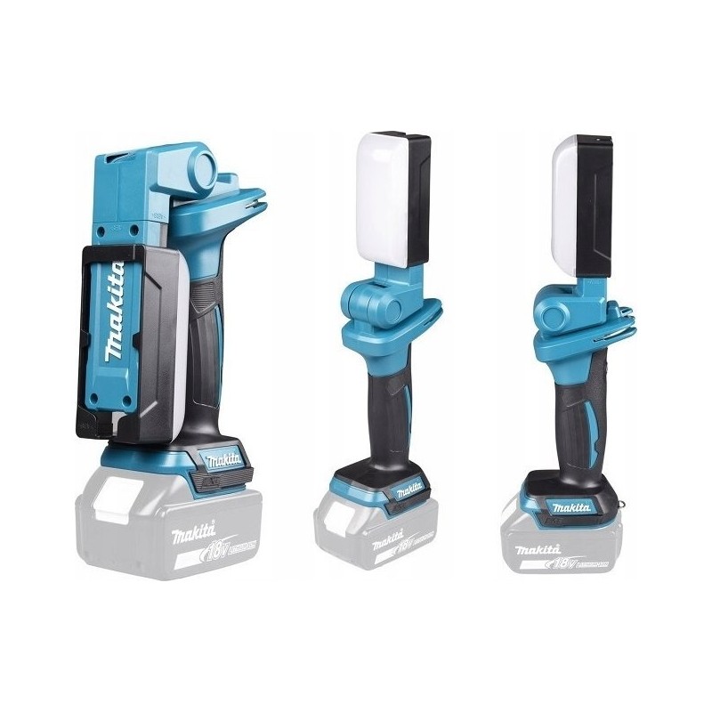 Lampka akumulatorowa 14,4V / 18V MAKITA DML816X z możliwością składania i obracania głowicy w zakresie 180°, dostarczana bez akumulatora i ładowarki, z matowym wykończeniem na wyposażeniu.