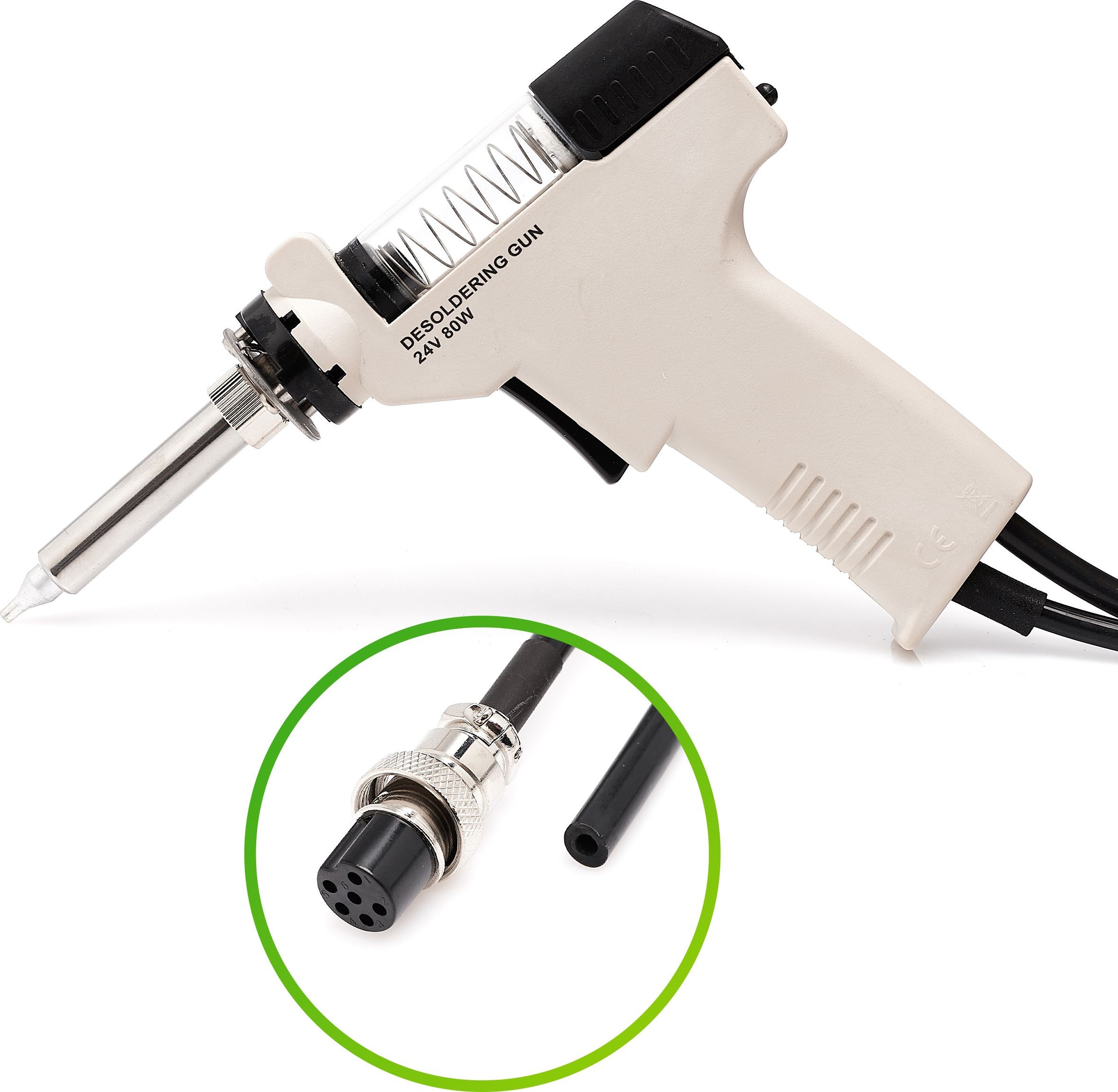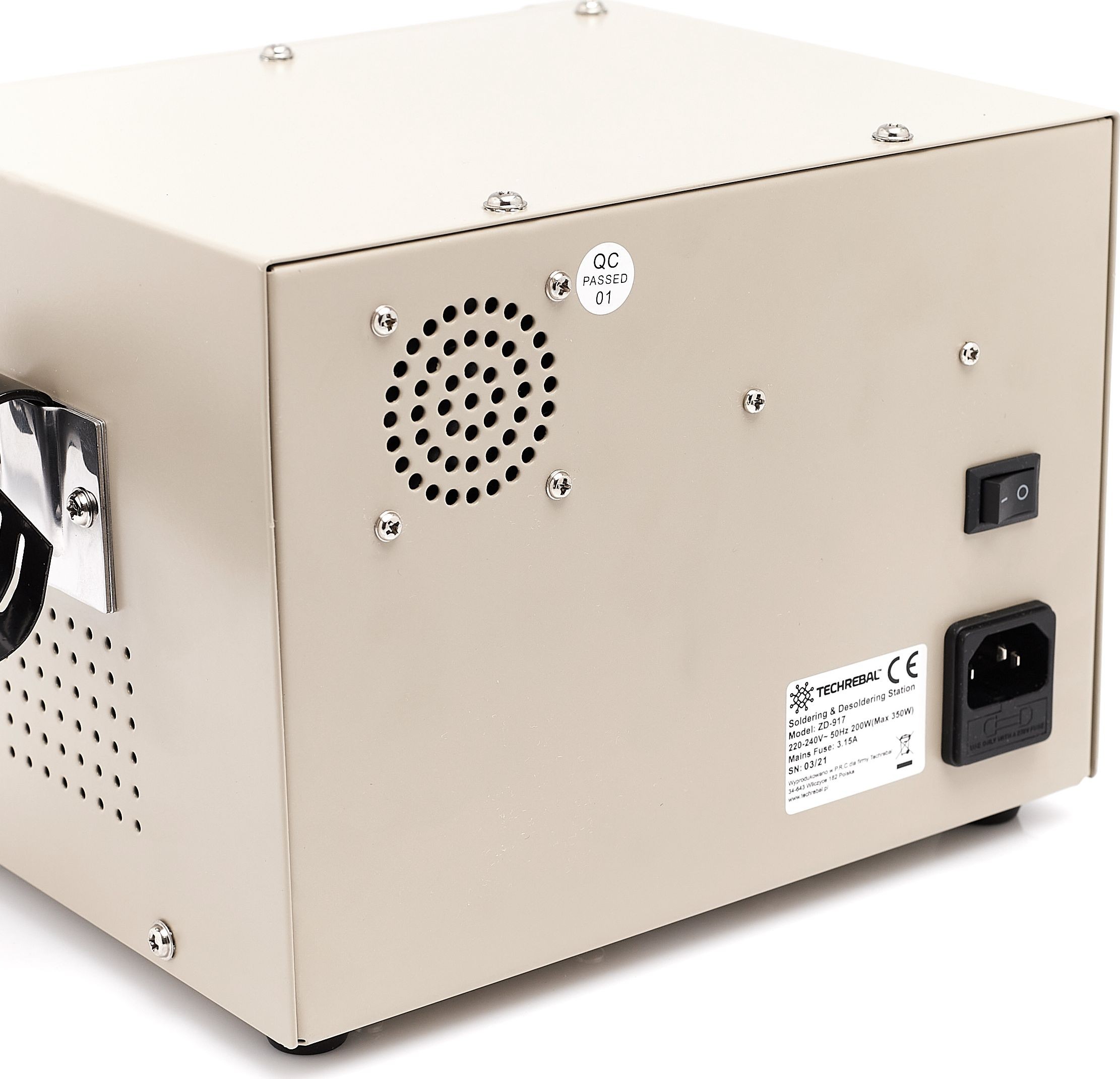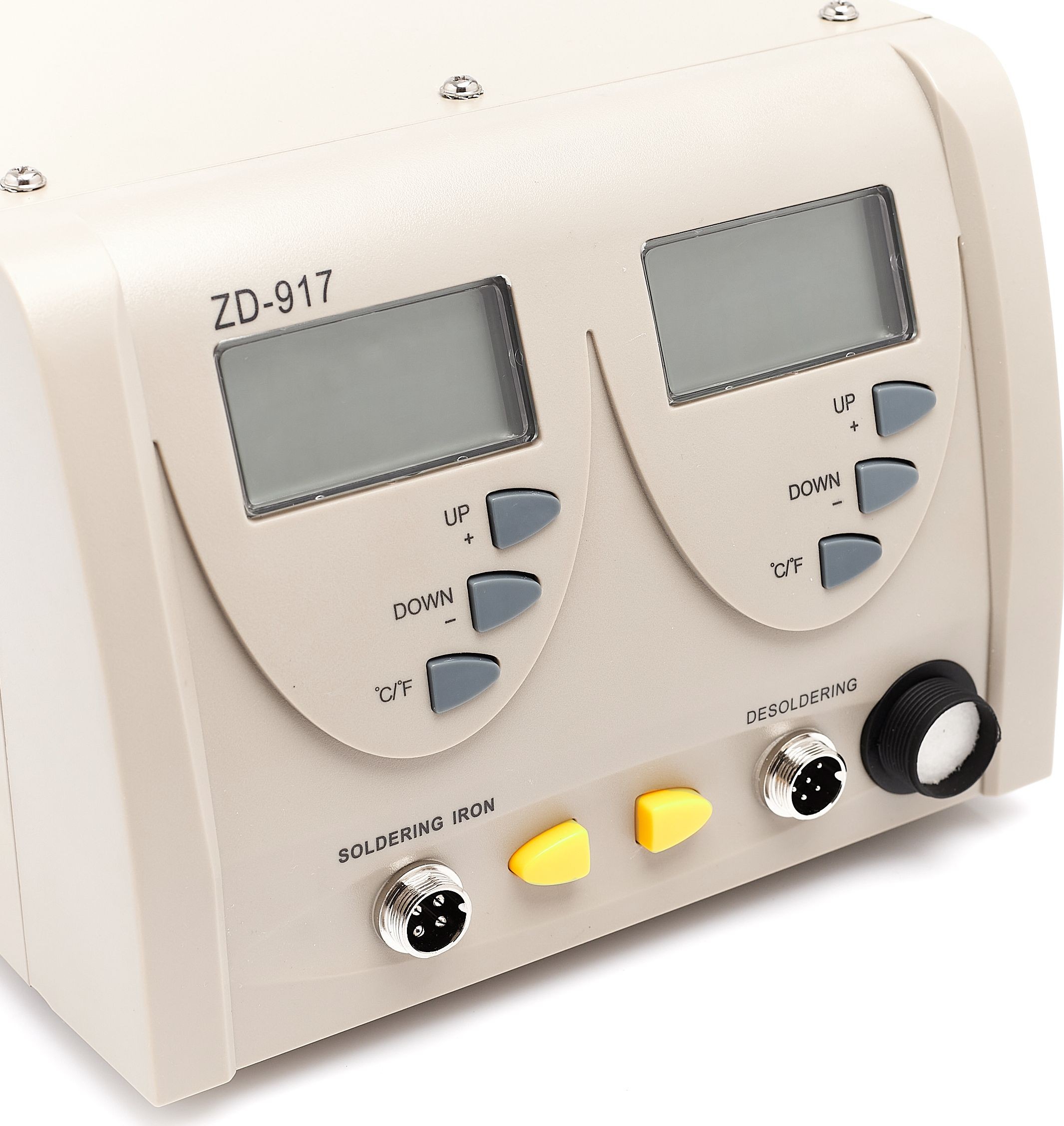 Stacja lutownicza służąca do demontażu elementów elektronicznych z płytek drukowanych PCB. Stacja z wbudowanym wewnętrznym kompresorem, który po naciśnięciu spustu pistoletu uruchamia się wytwarzając podciśnienie. W porównaniu do zwykłych odsysaczy jest wygodniejsza, oraz pozwala na szybszą pracę - sama podgrzewa cyne. Jednostka centralna wyposażona została w duży i czytelny wyświetlacz LCD z podświetlenie, który ukazuję ustawioną wartość temperatury, oraz temperaturę zmierzoną (odczytaną) z grotu lutownicy. Temperatura regulowana jest ze skokiem 1°C w zakresie od 160°C do 480°C. Stacja ZD-917 to wykonana z wysokiej jakości podzespołów, charakteryzuje się dużą precyzją działania. Może być wykorzystywana do lutowania / wlutowywania wszelkiego rodzajów układów scalonych z płytek bez ryzyka ich uszkodzenia, oraz do typowego lutowania podzespołów elektronicznych.