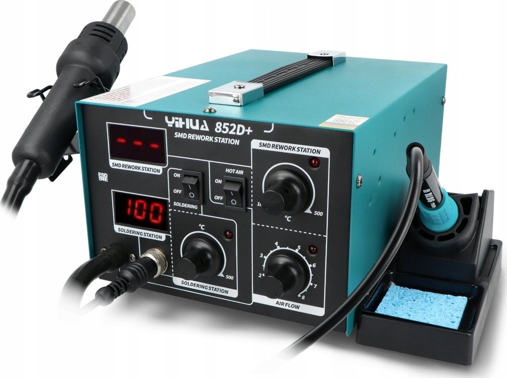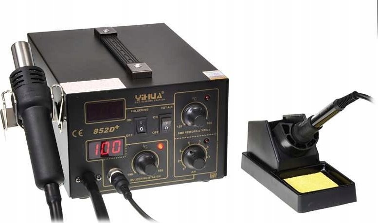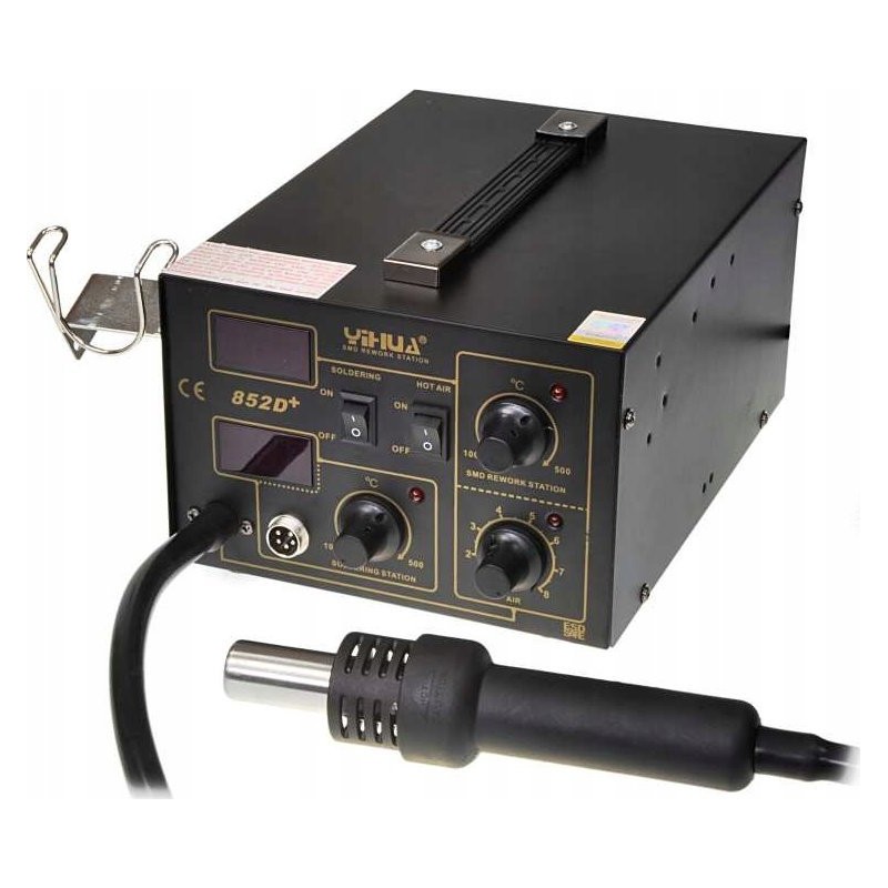 Elektryczna stacja lutownicza Yihua 852D+ została wyposażona w mocny element grzejny gwarantujący szybkie nagrzewanie oraz trwałość grzałki. Posiada płynną regulację nawiewu oraz temperatury. Stacja została zaprojektowana do prac lutowniczych z takimi komponentami jak układy SOIC, QFP, PLCC, BGA, SMD..... Jak również do nagrzewania, wygrzewania koszulek termokurczliwych, rozmrażania, rozpuszczania klejów, opalania farb, podgrzewania....