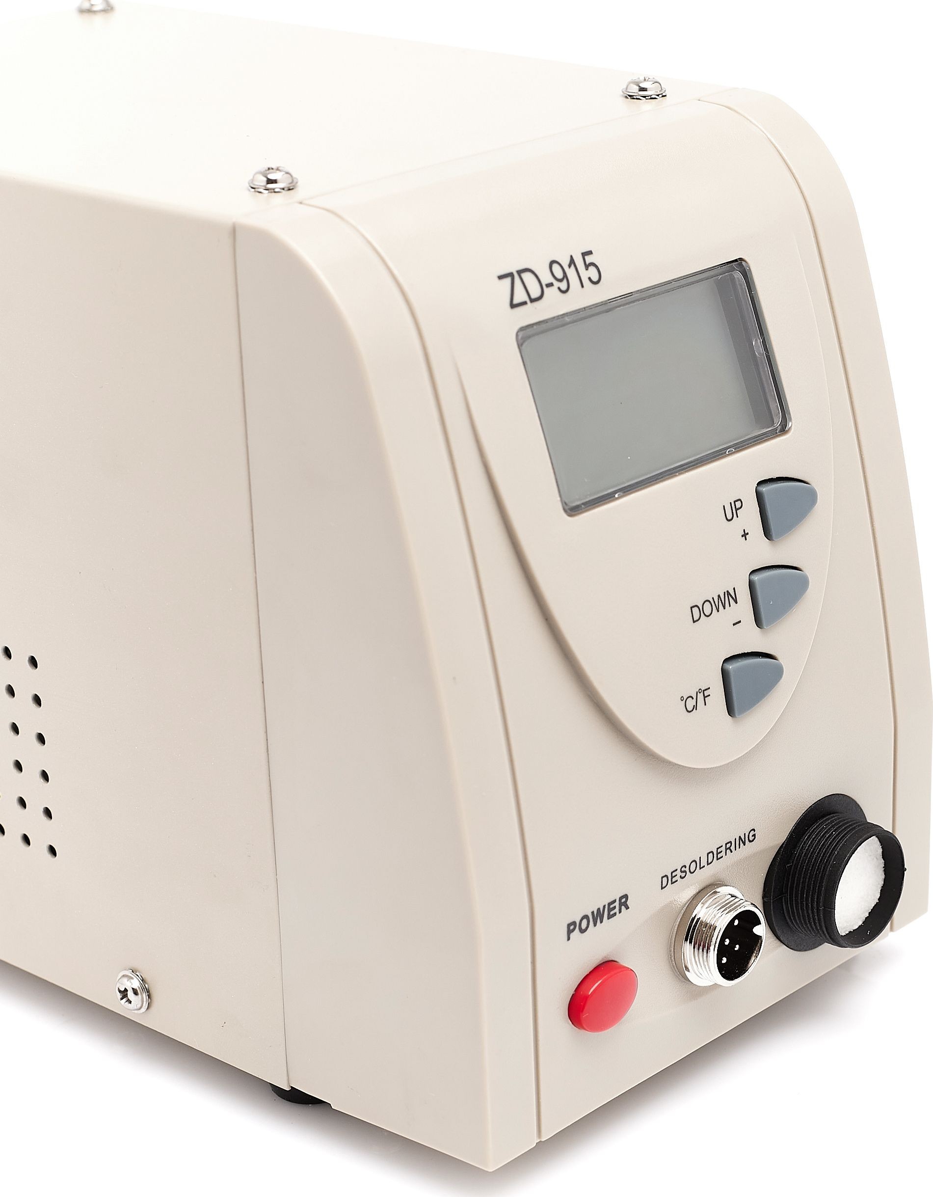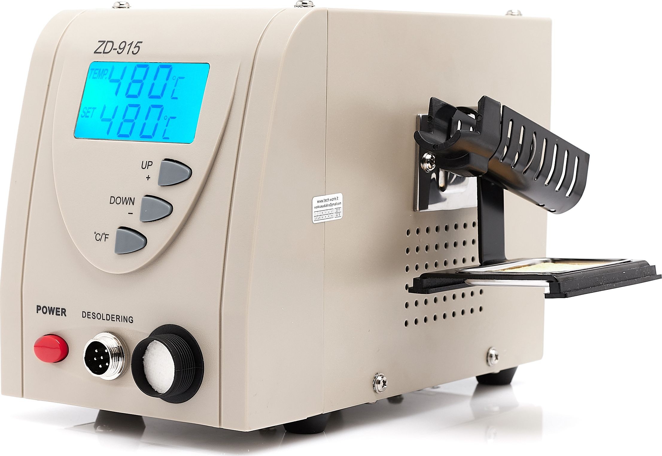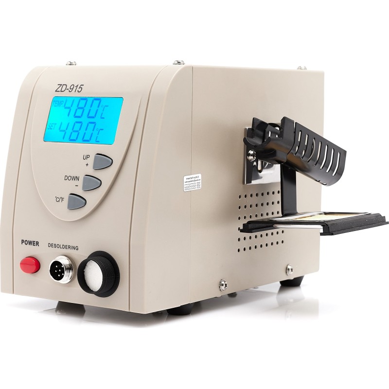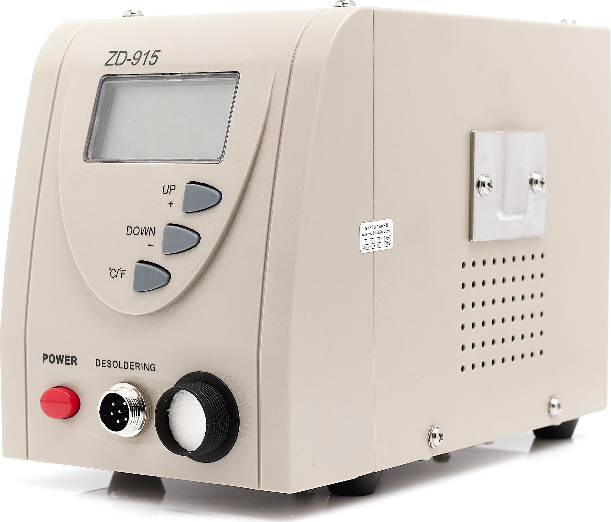 Stacja lutownicza służąca do demontażu elementów elektronicznych z płytek drukowanych PCB. Stacja z wbudowanym wewnętrznym kompresorem, który po naciśnięciu spustu pistoletu uruchamia się wytwarzając podciśnienie. W porównaniu do zwykłych odsysaczy jest wygodniejsza, oraz pozwala na szybszą pracę - sama podgrzewa cyne. Jednostka centralna wyposażona została w duży i czytelny wyświetlacz LCD z podświetlenie, który ukazuję ustawioną wartość temperatury, oraz temperaturę zmierzoną (odczytaną) z grotu lutownicy. Temperatura regulowana jest ze skokiem 1°C w zakresie od 160°C do 480°C. Wydajna grzałka o mocy 90W poradzi sobie w wielu trudnych wypadkach.