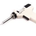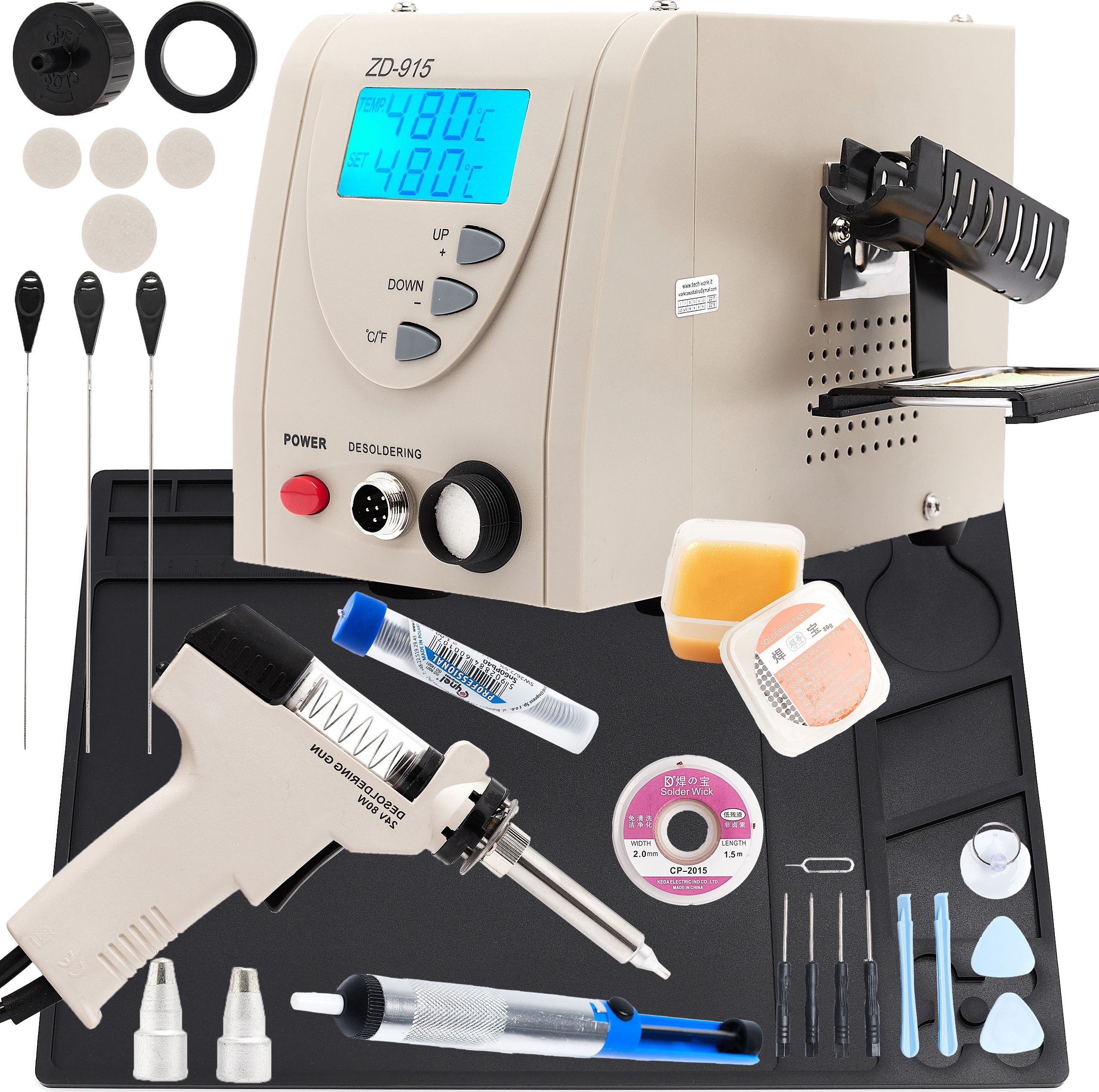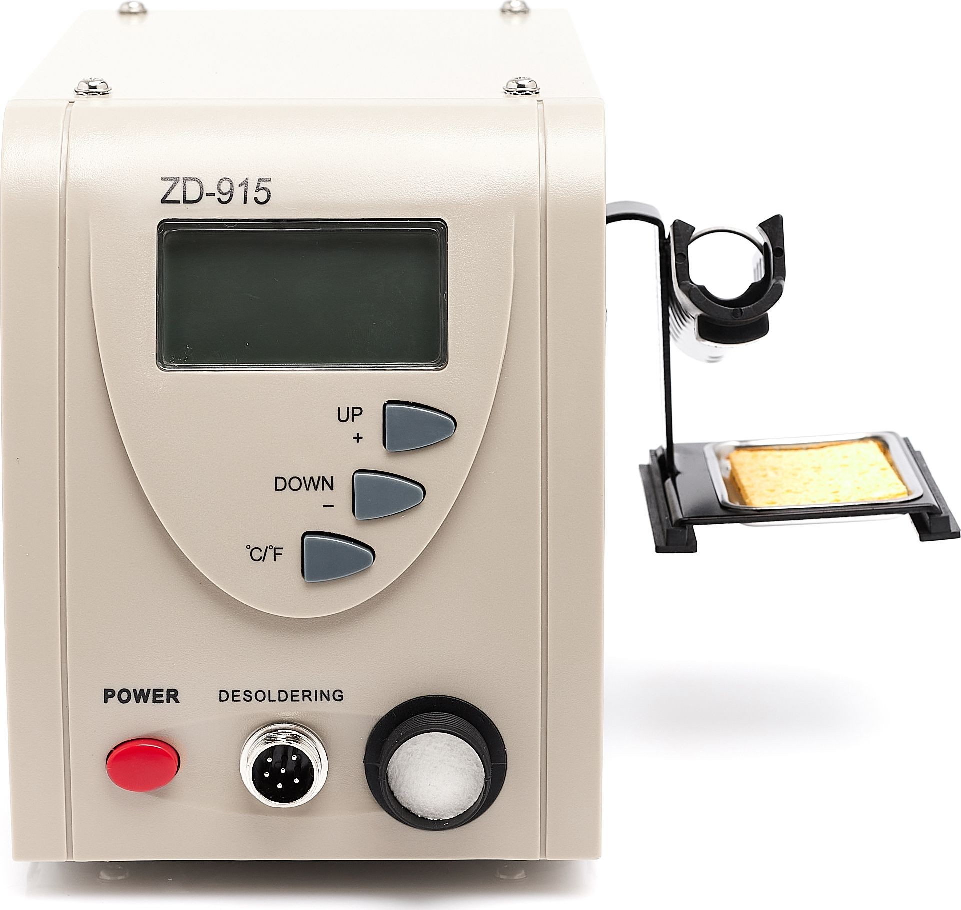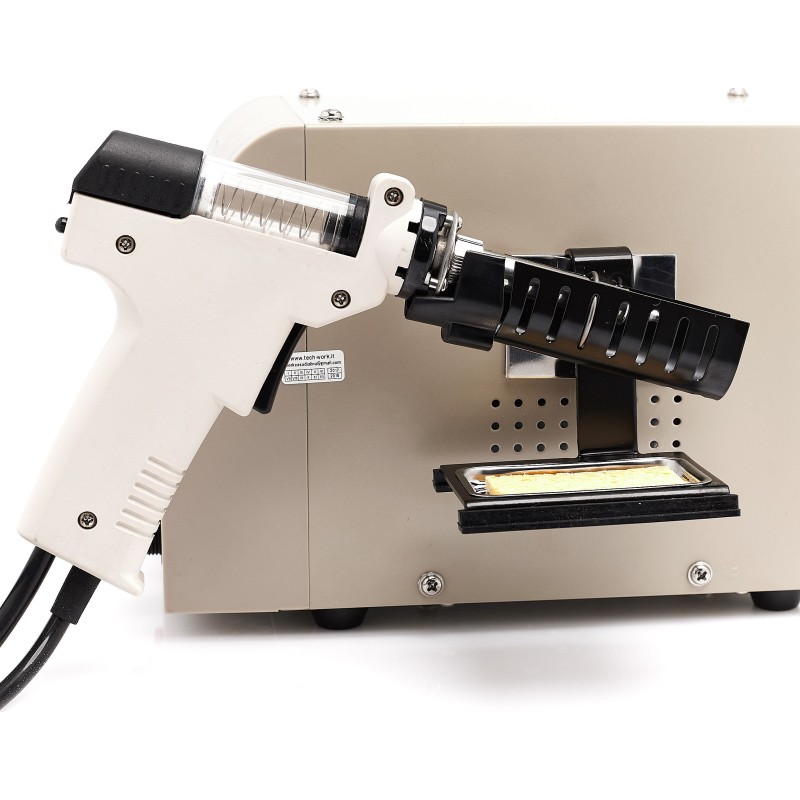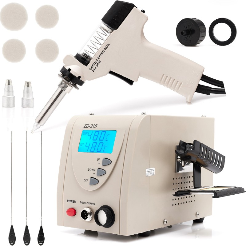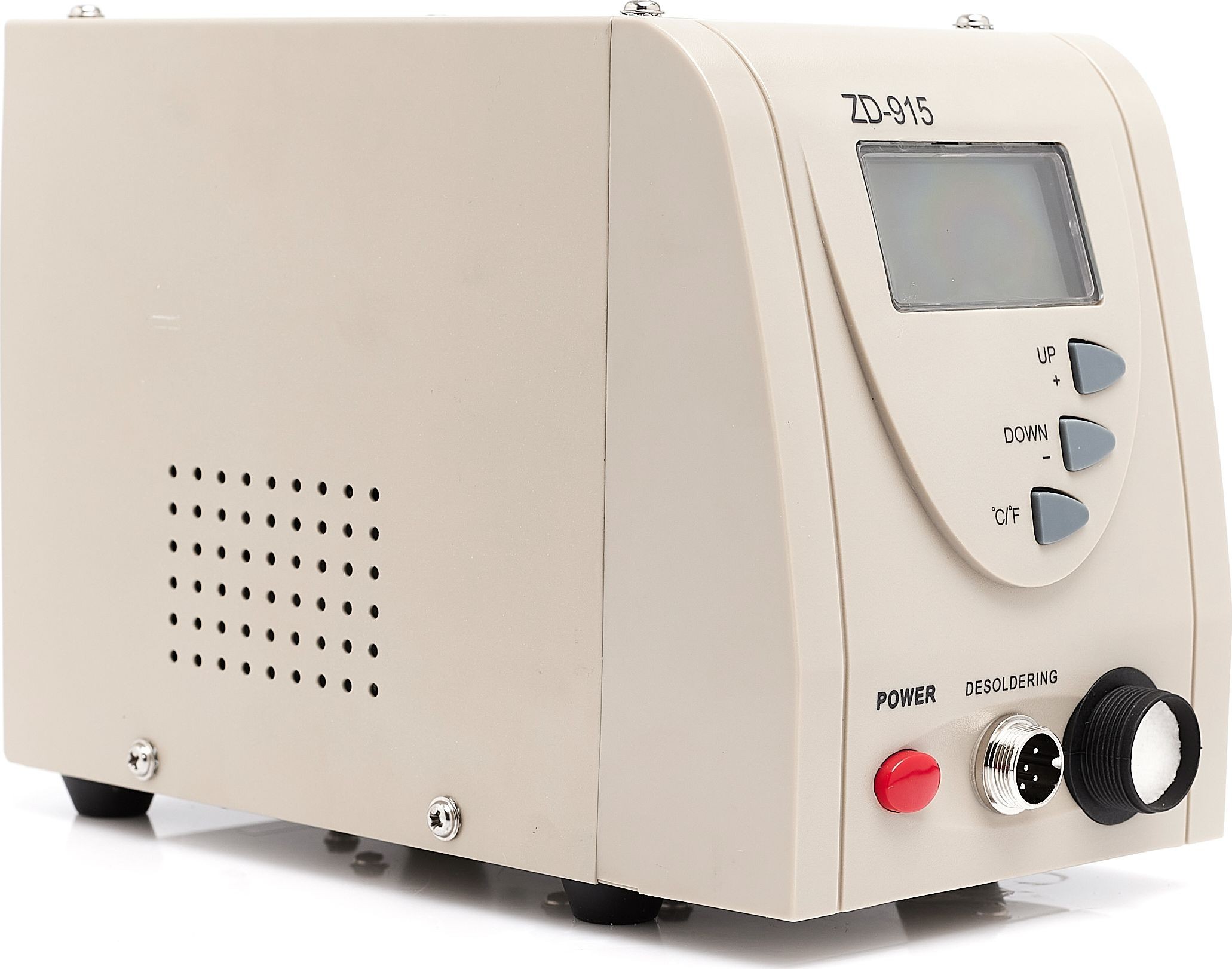 Stacja lutownicza służąca do demontażu elementów elektronicznych z płytek drukowanych PCB. Stacja z wbudowanym wewnętrznym kompresorem, który po naciśnięciu spustu pistoletu uruchamia się wytwarzając podciśnienie. W porównaniu do zwykłych odsysaczy jest wygodniejsza, oraz pozwala na szybszą pracę - sama podgrzewa cyne. Jednostka centralna wyposażona została w duży i czytelny wyświetlacz LCD z podświetlenie, który ukazuję ustawioną wartość temperatury, oraz temperaturę zmierzoną (odczytaną) z grotu lutownicy. Temperatura regulowana jest ze skokiem 1°C w zakresie od 160°C do 480°C. Wydajna grzałka o mocy 90W poradzi sobie w wielu trudnych wypadkach.