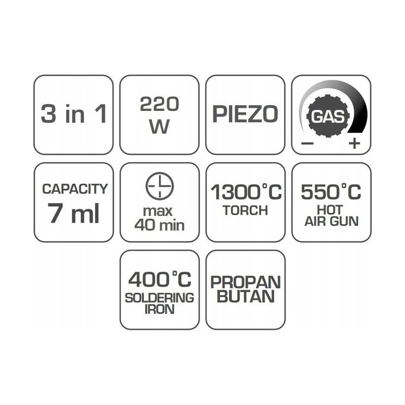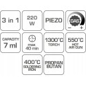 - posiada 3 funkcje: lutownicy (400°C) oraz dodatkowo palnika (1300°C) i opalarki (550°C);