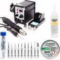 - W skład zestawu wchodzi: stacja lutownicza, kolba grotowa, kolba gorącego powietrza, podstawki, gąbka do czyszczenia, dysze i zestaw grotów