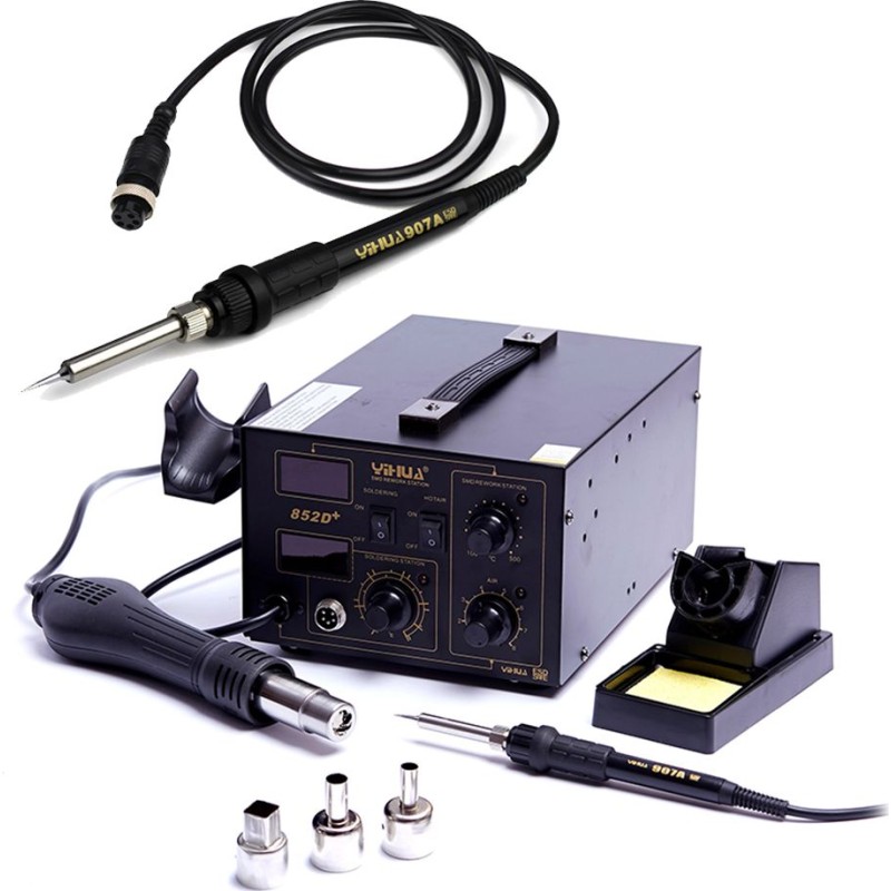 Stacja lutownicza Yihua 852D+ została wyposażona w mocny element grzejny gwarantujący szybkie nagrzewanie oraz trwałość grzałki. Posiada płynną regulacje nawiewu oraz temperatury. Stacja została zaprojektowana do prac lutowniczych z takimi komponentami jak układy SOIC, QFP, PLCC, BGA, SMD itd. Jak również nagrzewaniem, wygrzewaniem koszulek termokurczliwych, rozmrażaniem, rozpuszczaniem klejów, opalaniem farb, podgrzewaniem itp.