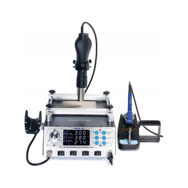 Yihua 853AAA+ wypełnia lukę w urządzeniach do demontażu z niewielkich płyt takich jak np. telefony,nawigacje układów BGA, QFP, PLCC czy innych drobnych elementów SMD. Dzięki połączeniu podgrzewacza z lutownicą hotair na statywie praca ta jest wygodna gdyż serwisant ma obie ręce wolne podczas montażu. Dodatkowo urządzenie ma możliwość zapamiętania 3 programów pracy, co jest bardzo wygodny podczas zadań w profesjonalnych serwisach. Urządzenie zostało również wyposażone w bardzo mocną 75W lutownice, dzięki temu jest sprzętem bardzo uniwersalnym, kórej znajdzie swoje zastosowanie u każdego elektronika. Wymiary podgrzewacza to 120x120mm daje to dość mocy do podgrzania płyt z telefonów, nawigacji czy tabletów.